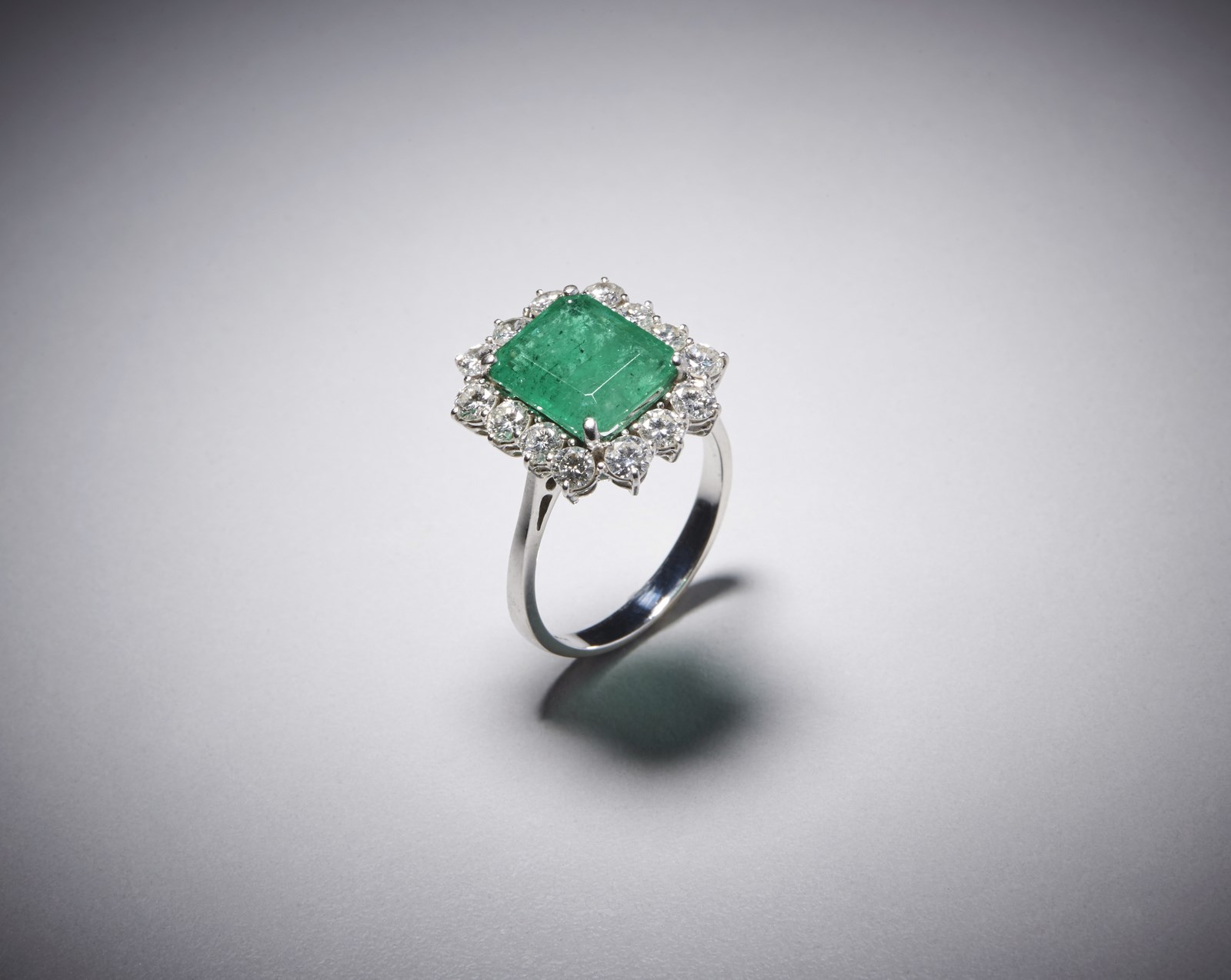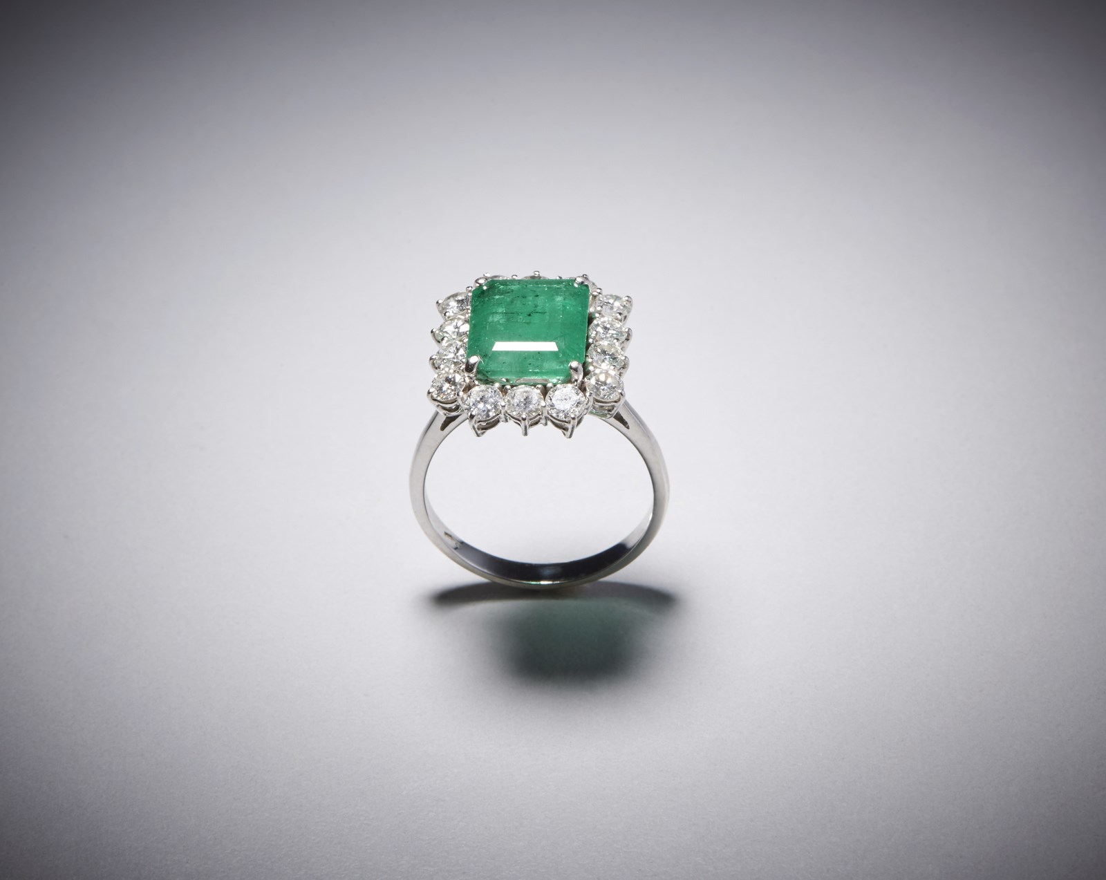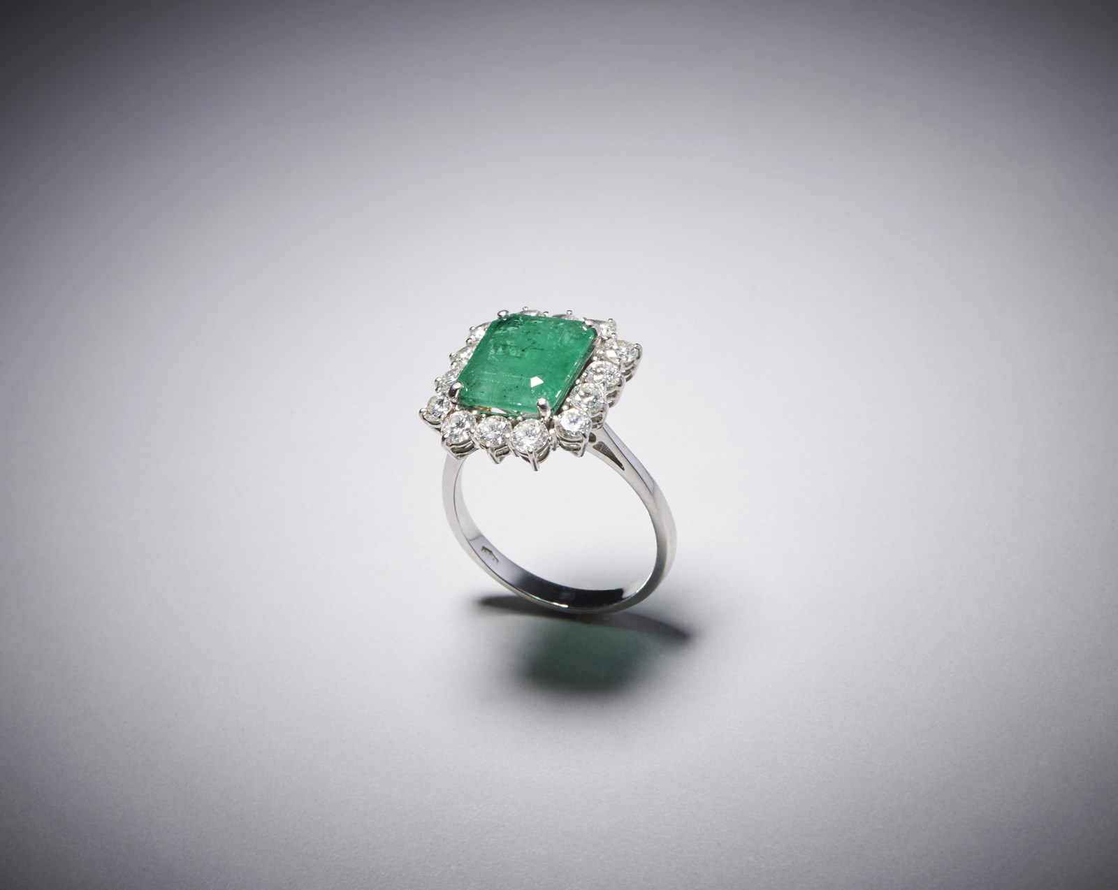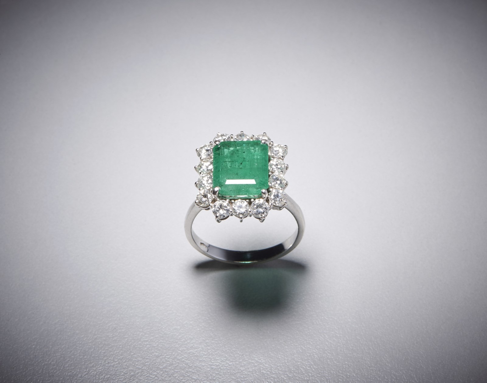 . - Anello classico in oro bianco 750/1000 con smeraldo centrale taglio a smeraldo di carati 2,70 circa e diamanti bianchi taglio a brillante ct. 1,50.