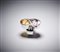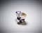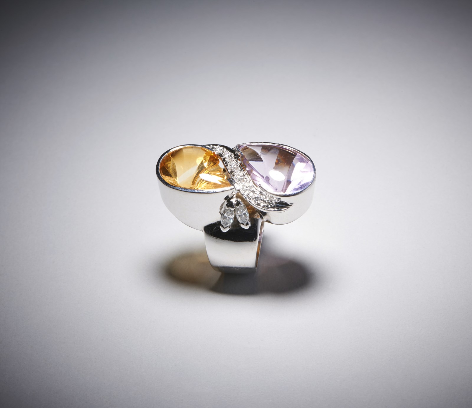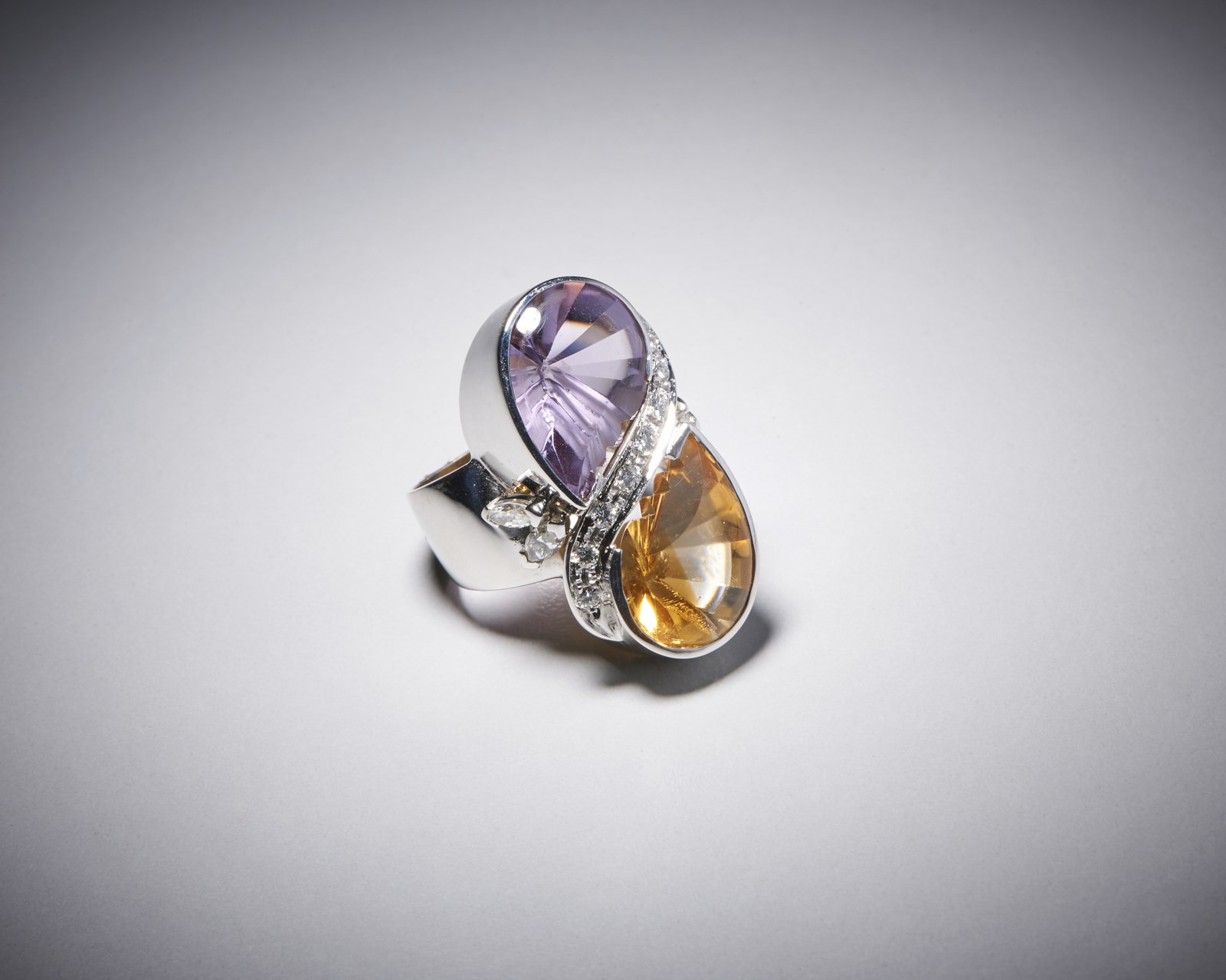 . Anello in oro bianco 750/1000 modello contrarie con diamanti bianchi taglio a brillante, ametista e topazio citrino taglio a goccia. . . . Peso totale gr. 18,60.
