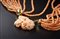 . Collana multifilo in corallo rosa con pendente di corallo inciso di forma floreale e chiusura in oro giallo 750/1000. . . . Peso lordo gr. 56,86