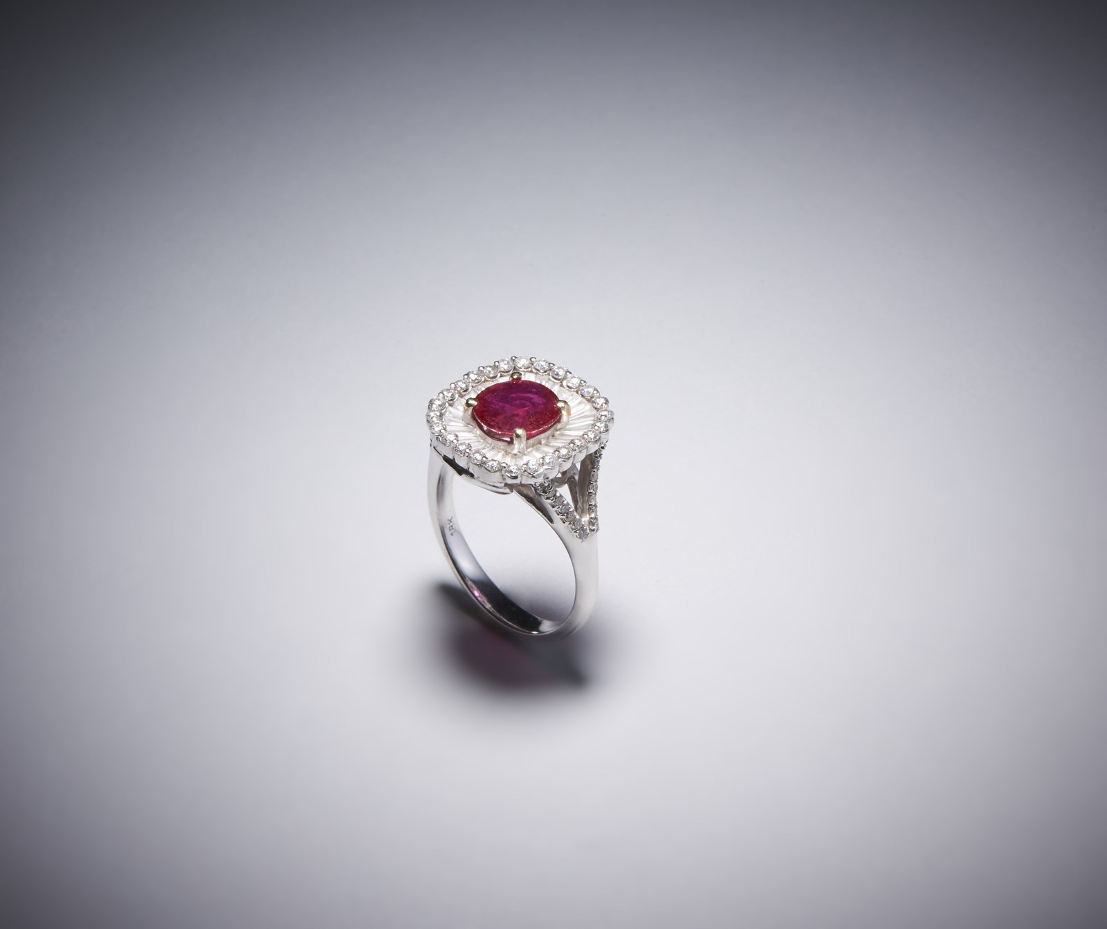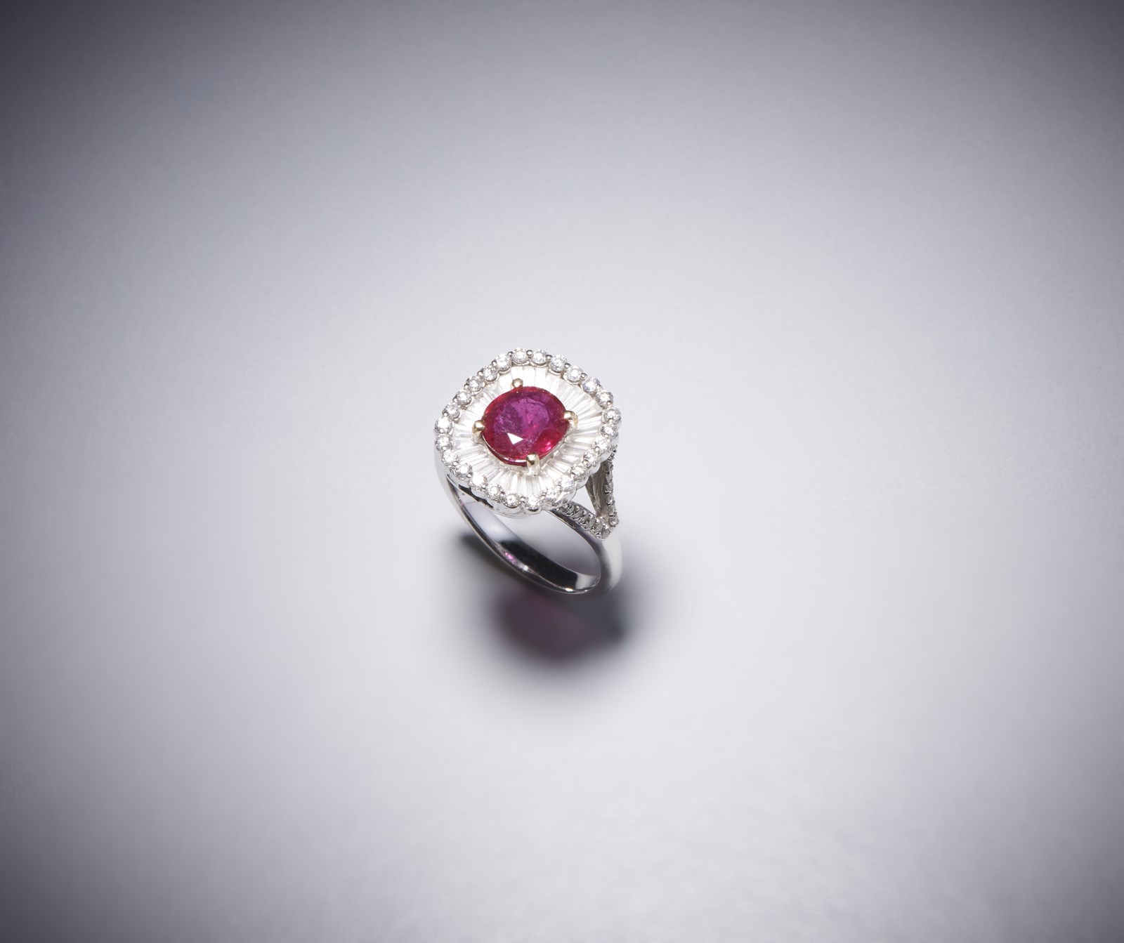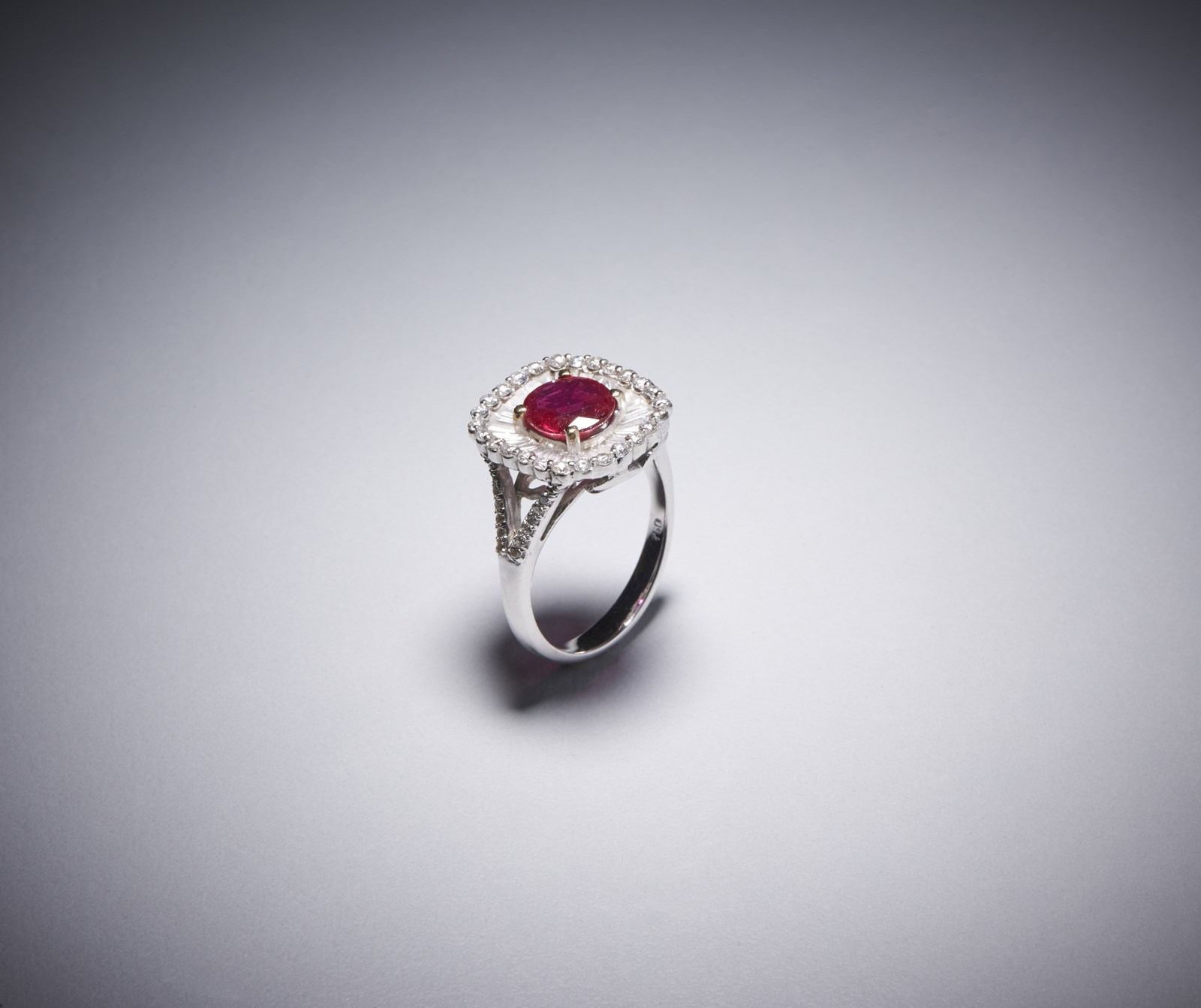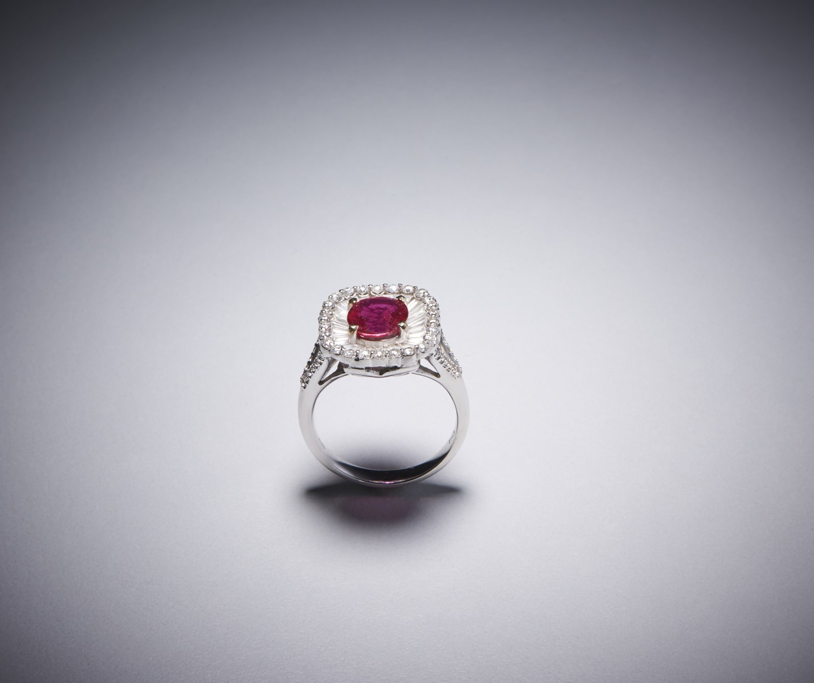 . Anello in oro 18 kt con rubino. -. . Anello in oro bianco 750/1000 con rubino centrale taglio a cuscino rosso intenso di circa 2,00 carati, diamanti bianchi taglio tapes per circa 1,90 carati e diamanti bianchi taglio a brillante per 0,90 carati circa.