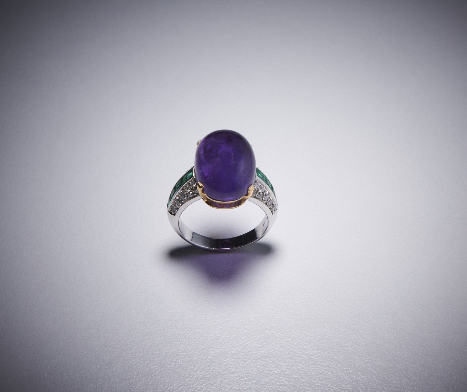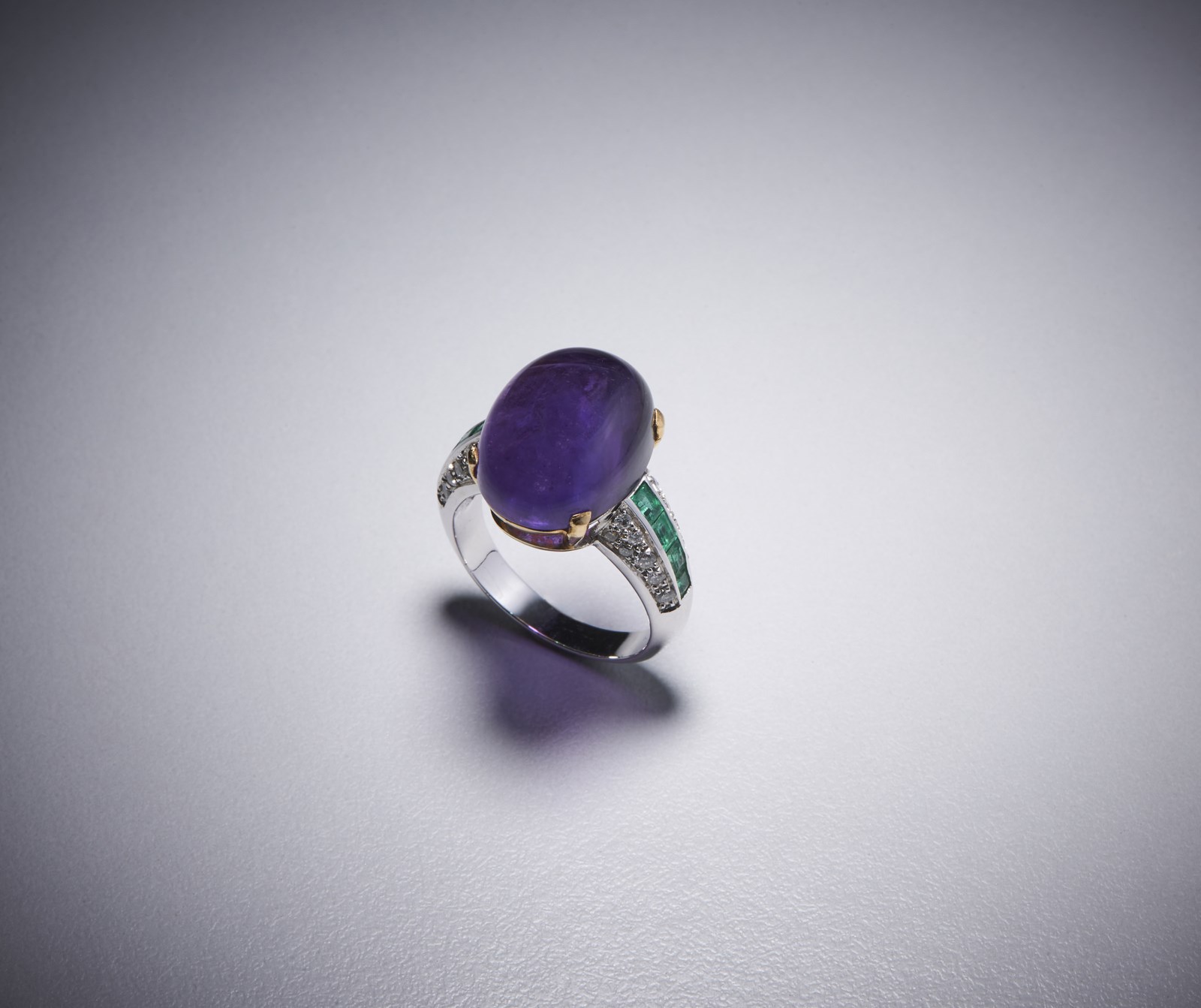. - Anello in oro bianco con ametista cabochon, piccoli diamanti e smeraldi.