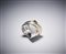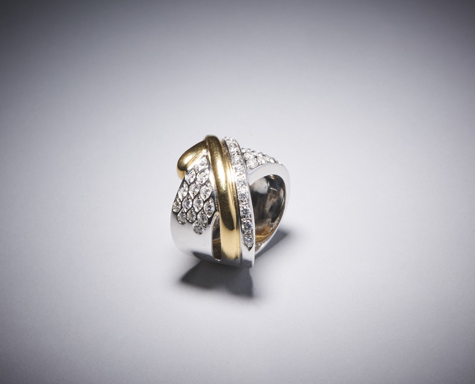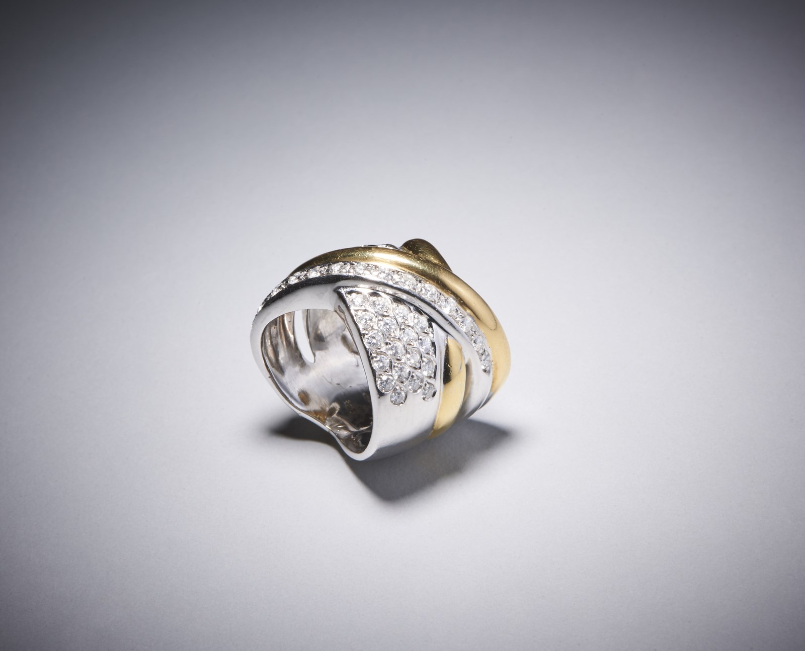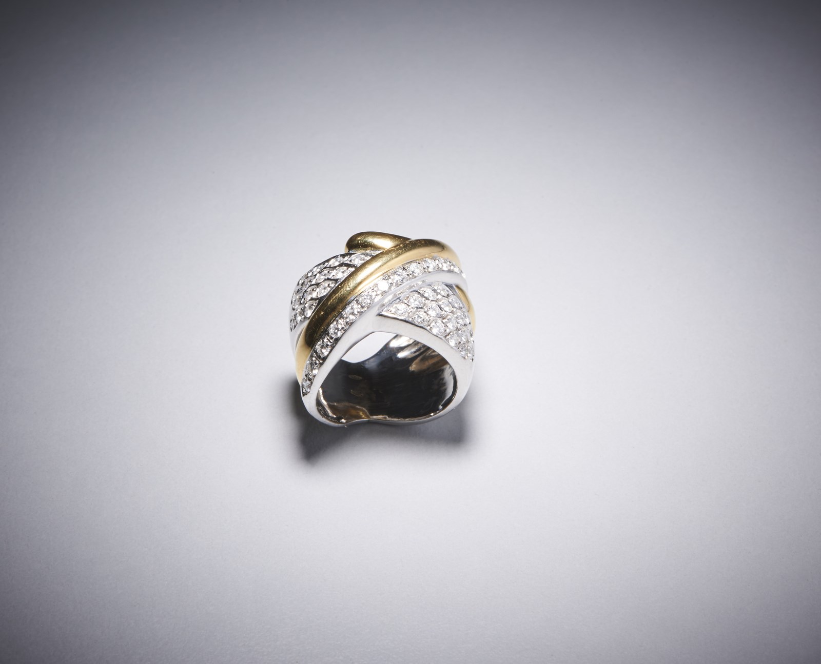 . Anello a fascia oro bicolore "intreccio " con diamanti. -. . Anello in oro bianco e giallo 750/1000 con pavè ad intreccio con diamanti bianchi taglio a brillante per circa 1,50 carati totali.