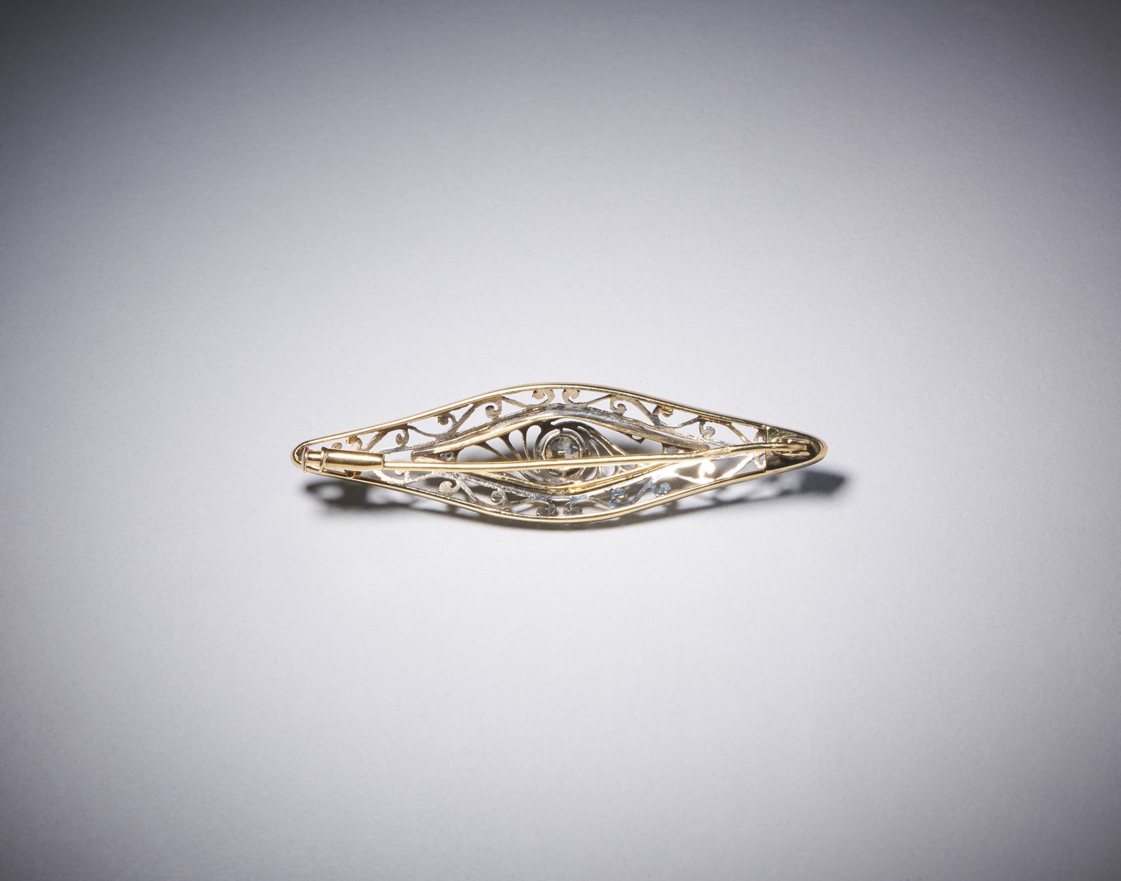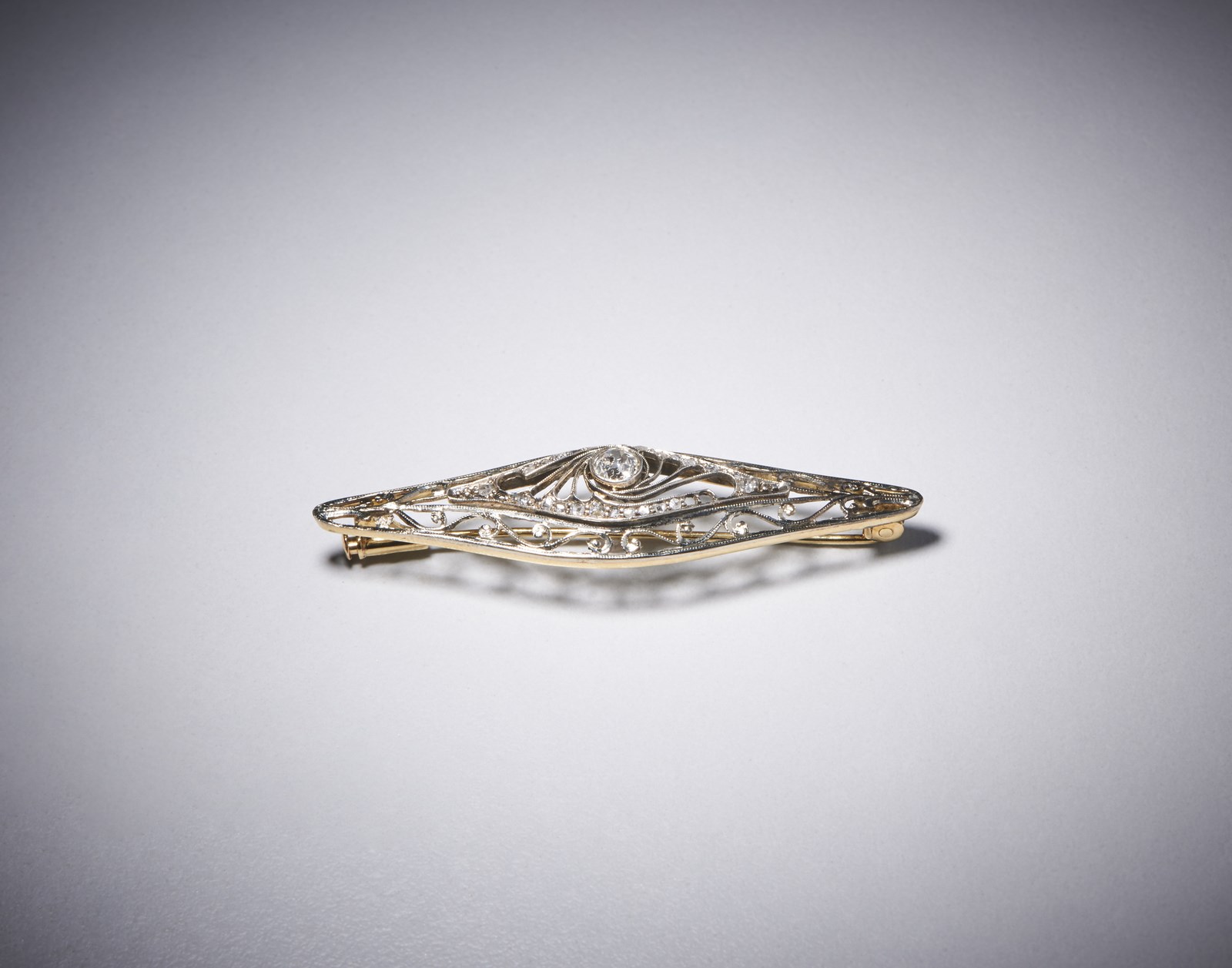 . - Spilla a losanga in oro giallo 750/1000 ed argento con diamante di taglio vecchio centrale di 0,40 ct. circa e piccoli diamanti di taglio a rosetta di cui 4 mancanti.