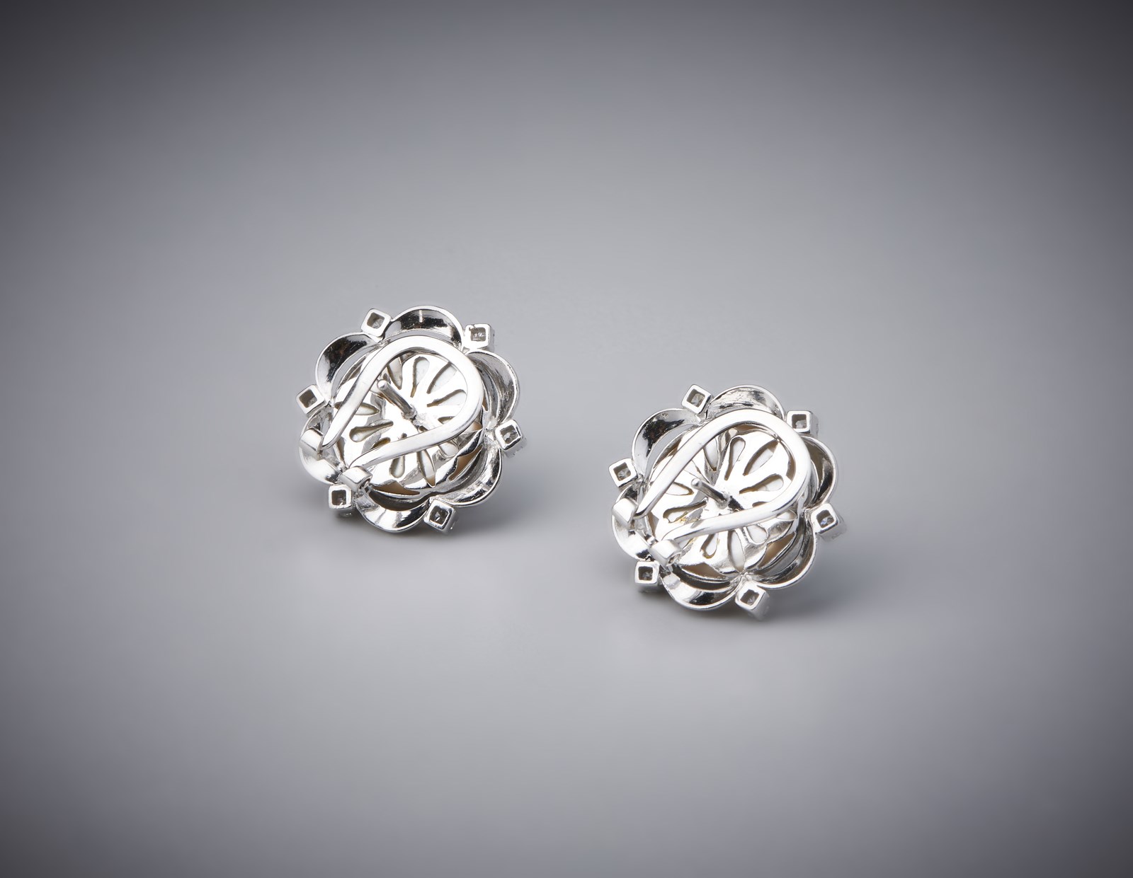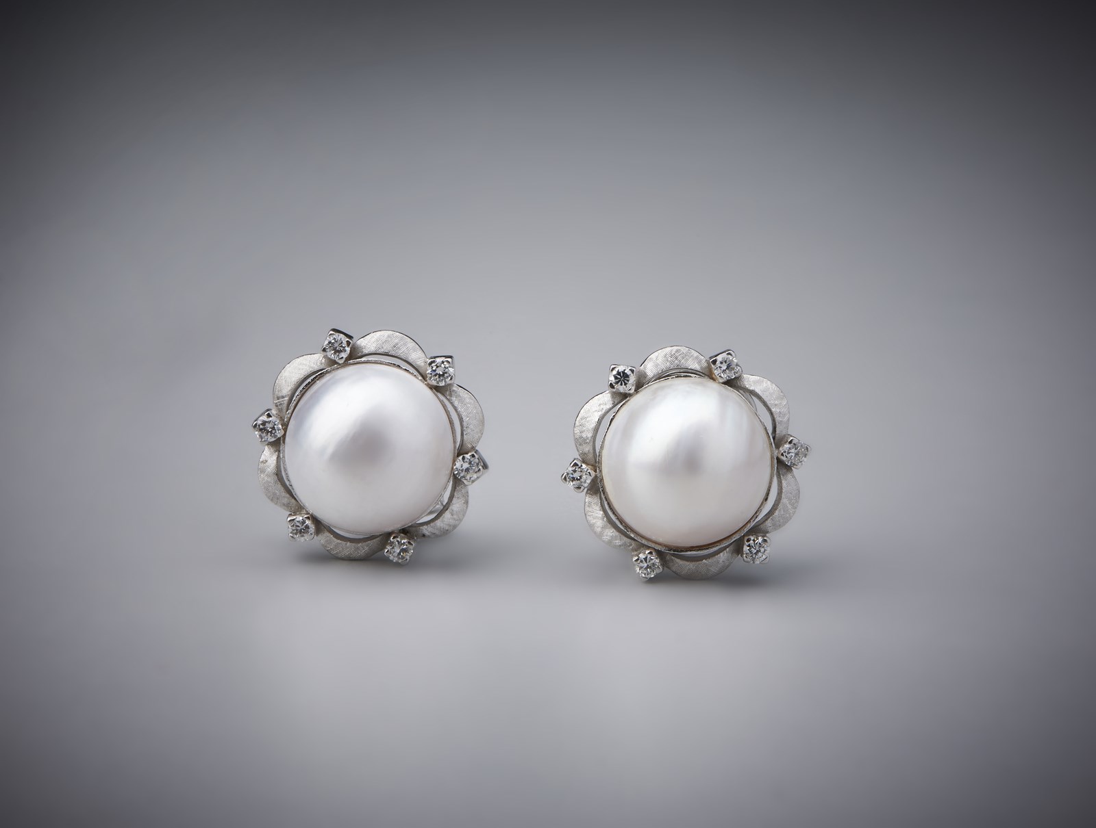 . - Orecchini artigianali in oro bianco 750/1000 con perle mabè e diamanti bianchi. .