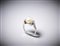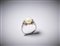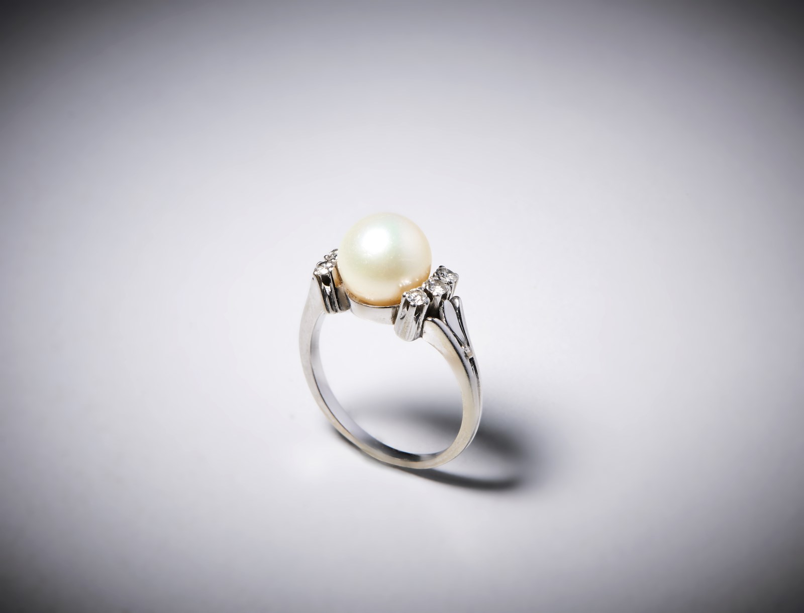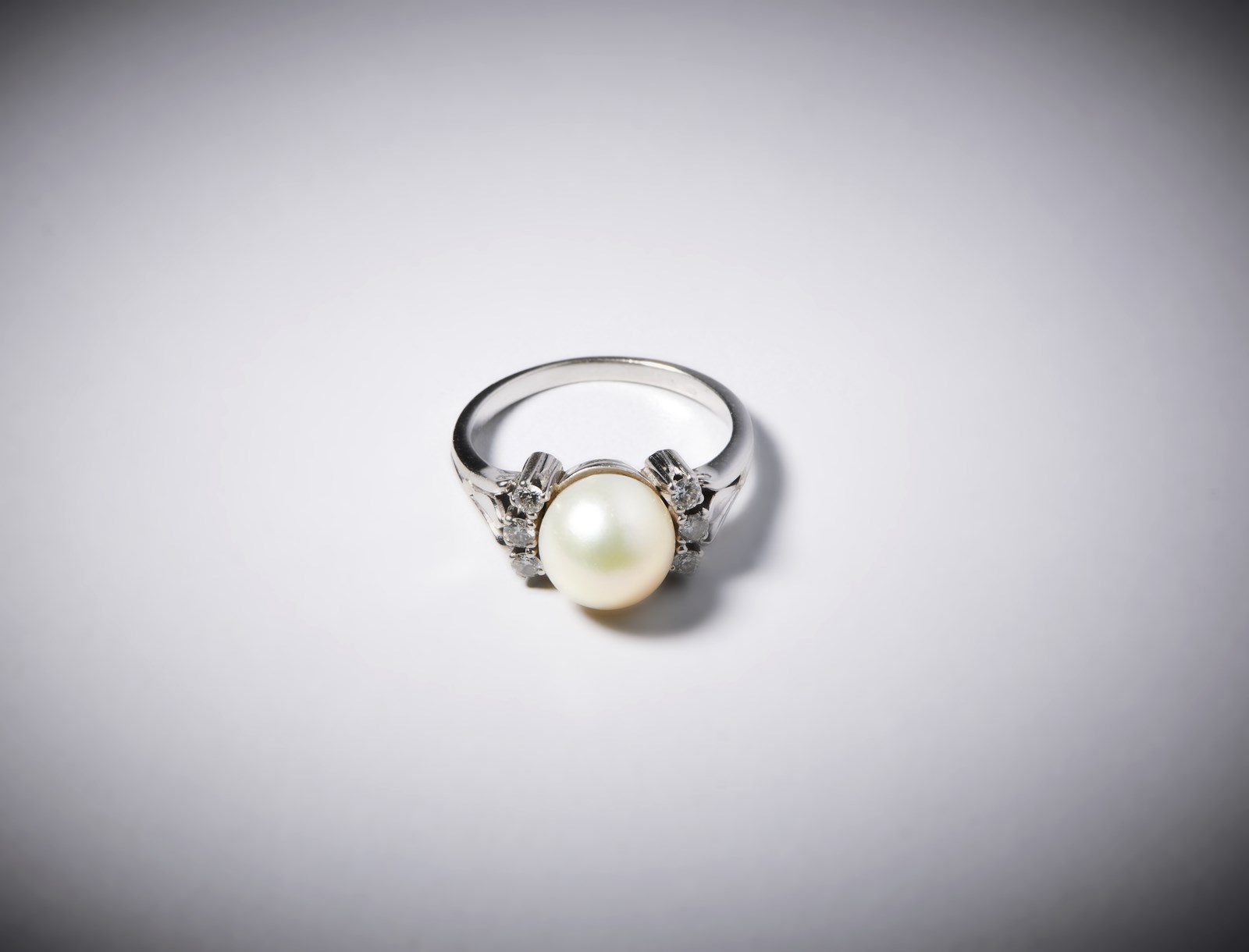 . - Anello in oro bianco 750/1000 con perla sferica e brillantini taglio huit huit di circa 0,40 ct.