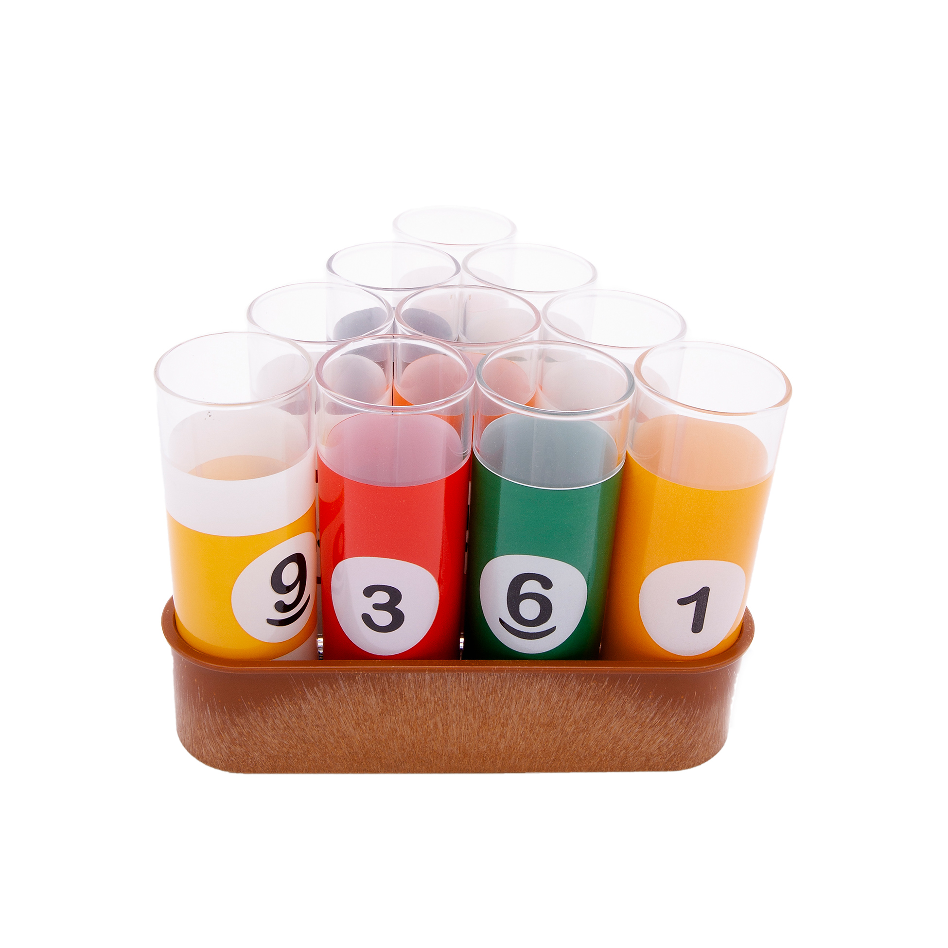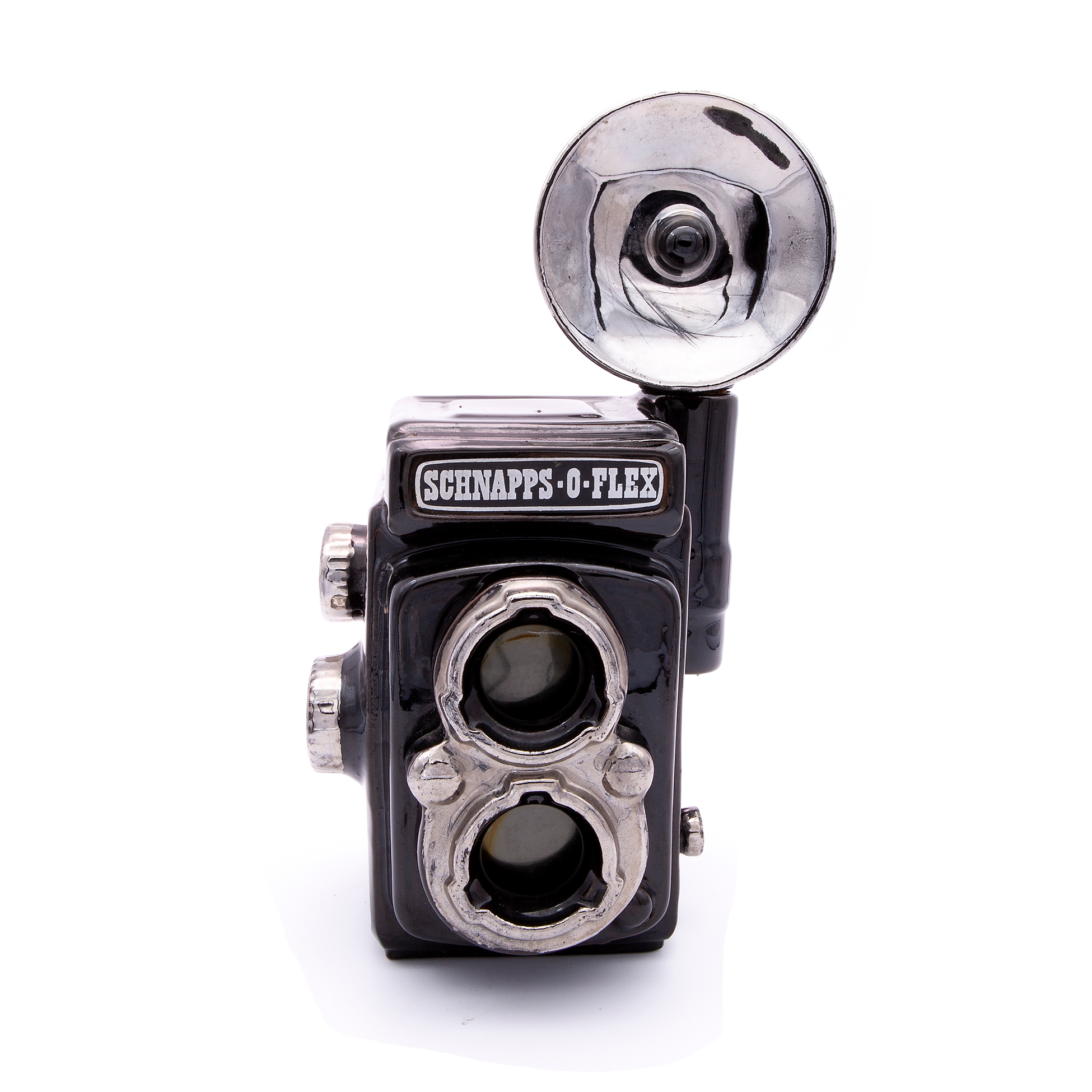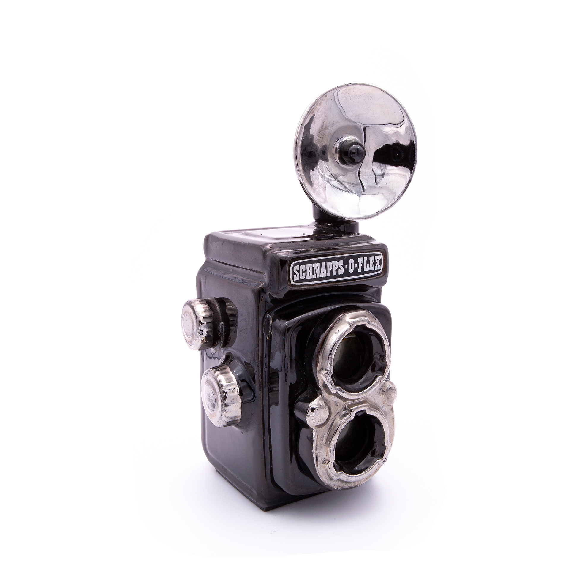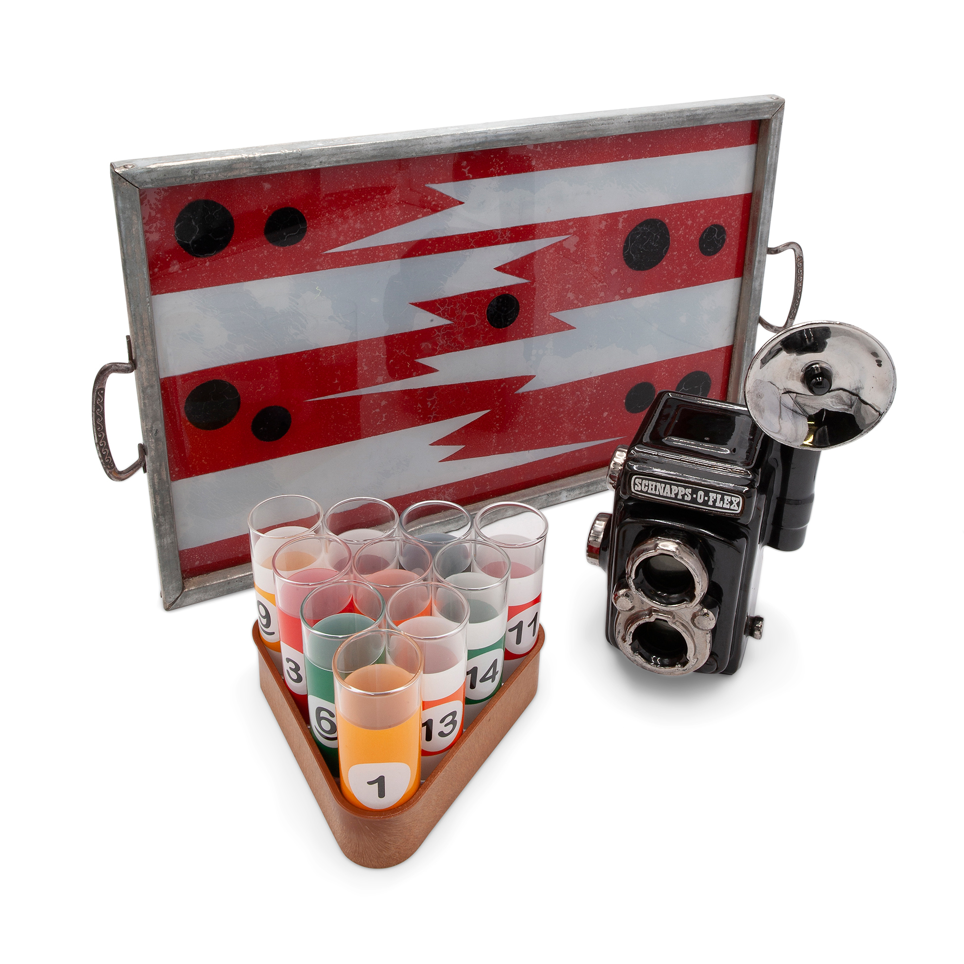 Set di bicchieri da shot, una fiasca in ceramica e un vassoio Gruppo composto da: 10 bicchieri da shot in vetro in forma di Palla 15 marchio Luminarc; fiasca in ceramica in forma di macchina fotografica e vassoio in metallo, legno e plastica con decori