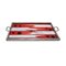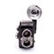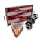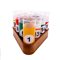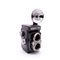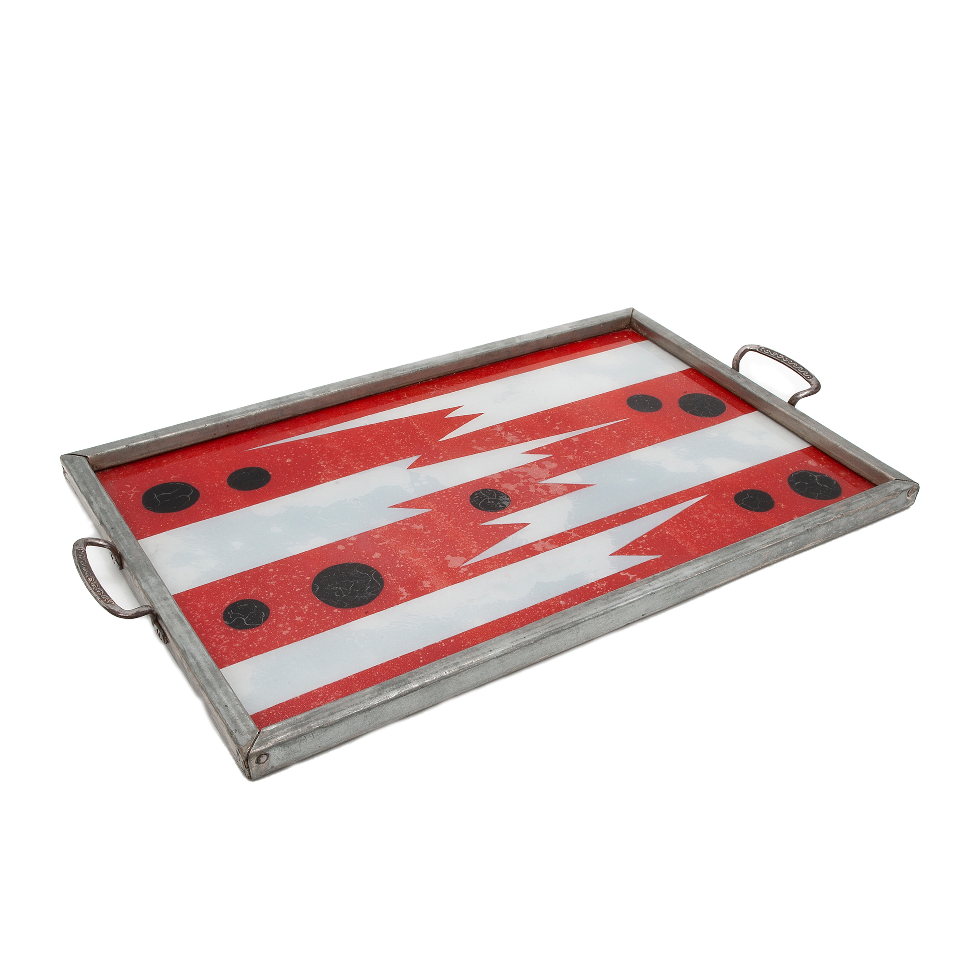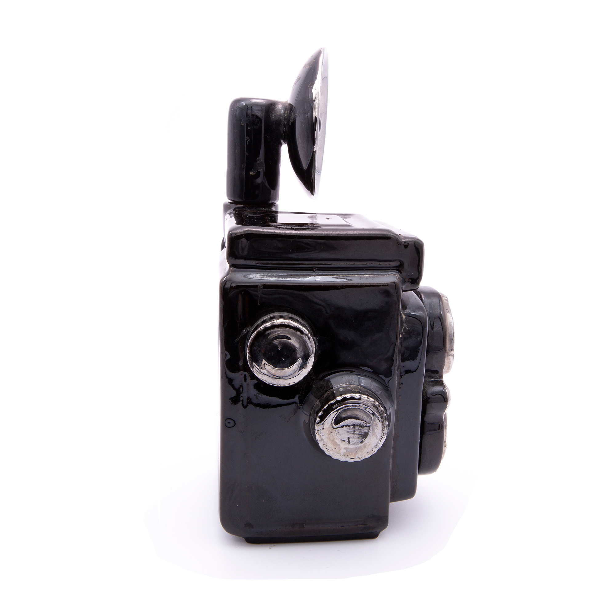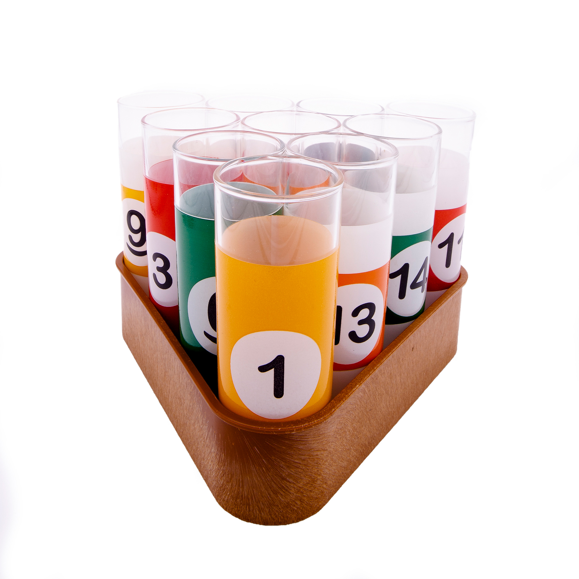Set di bicchieri da shot, una fiasca in ceramica e un vassoio Gruppo composto da: 10 bicchieri da shot in vetro in forma di Palla 15 marchio Luminarc; fiasca in ceramica in forma di macchina fotografica e vassoio in metallo, legno e plastica con decori