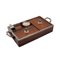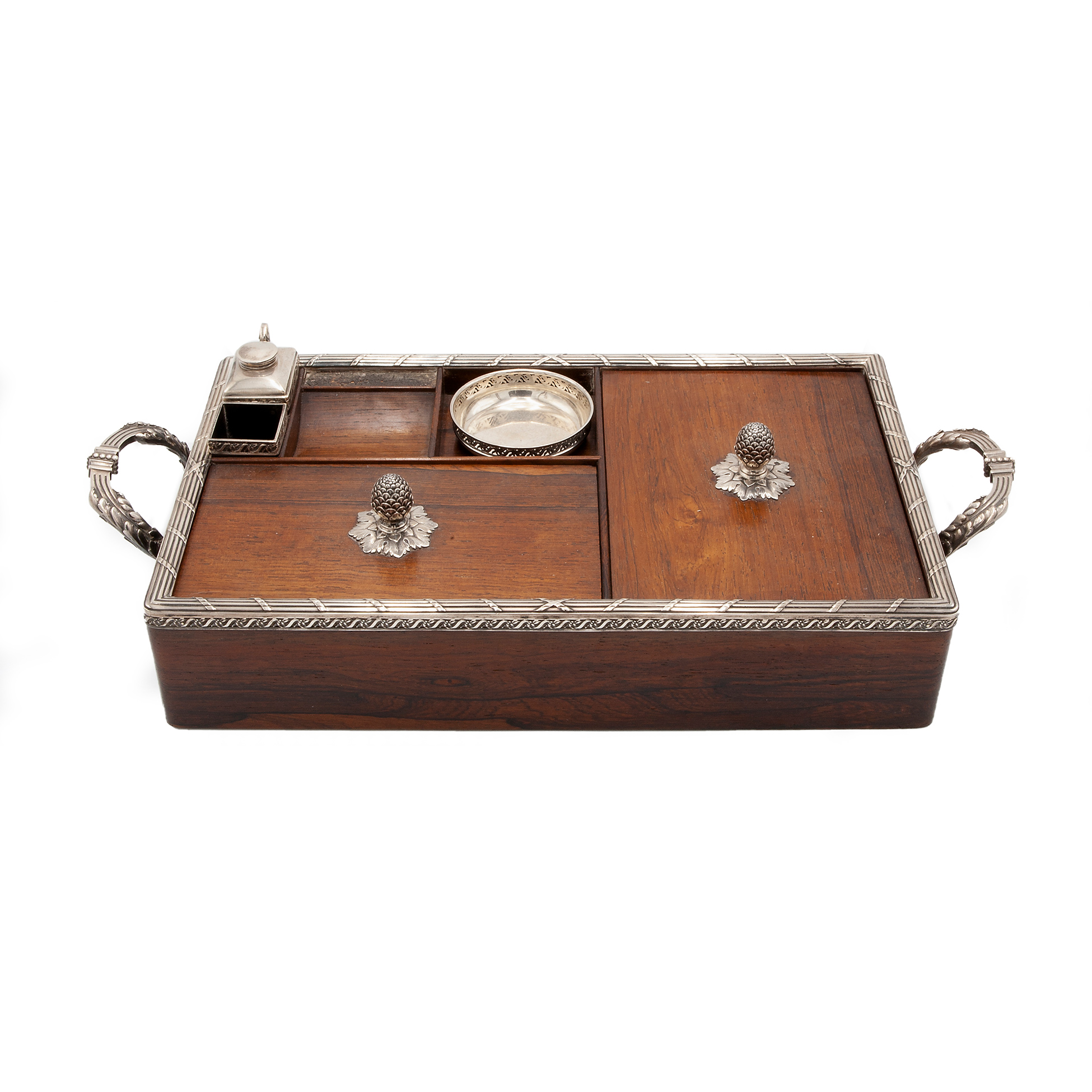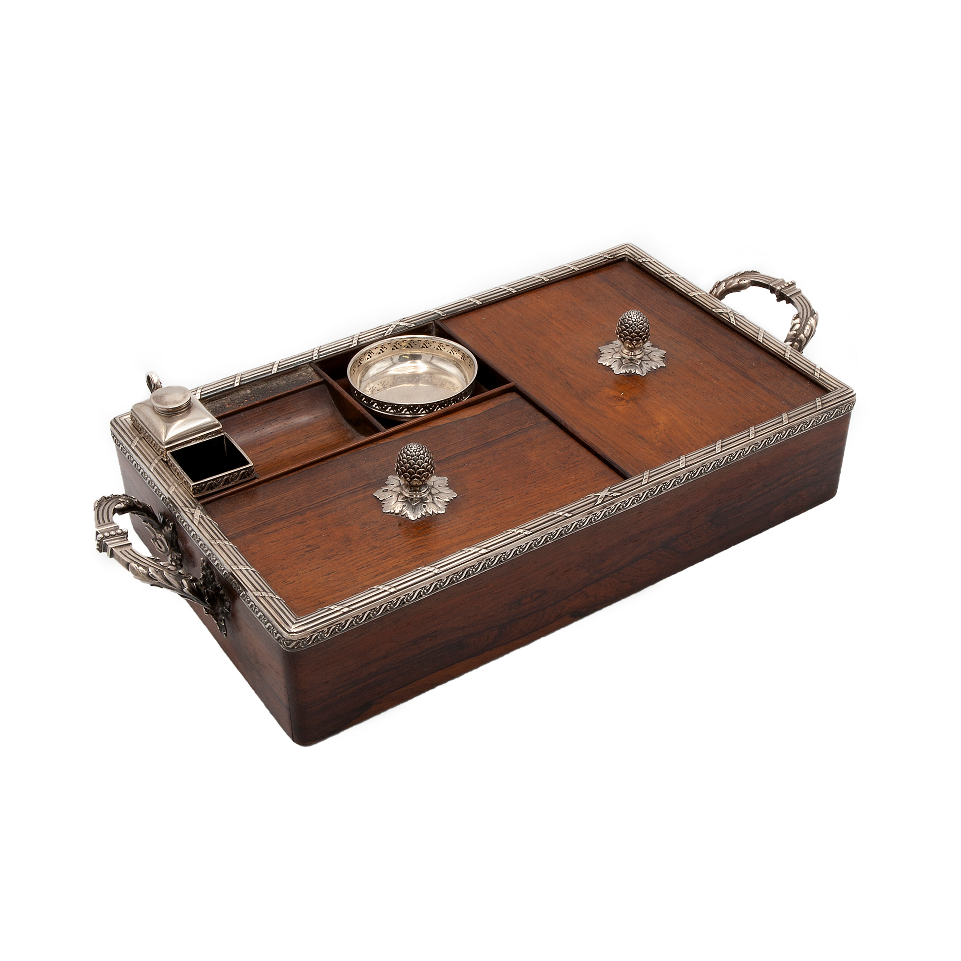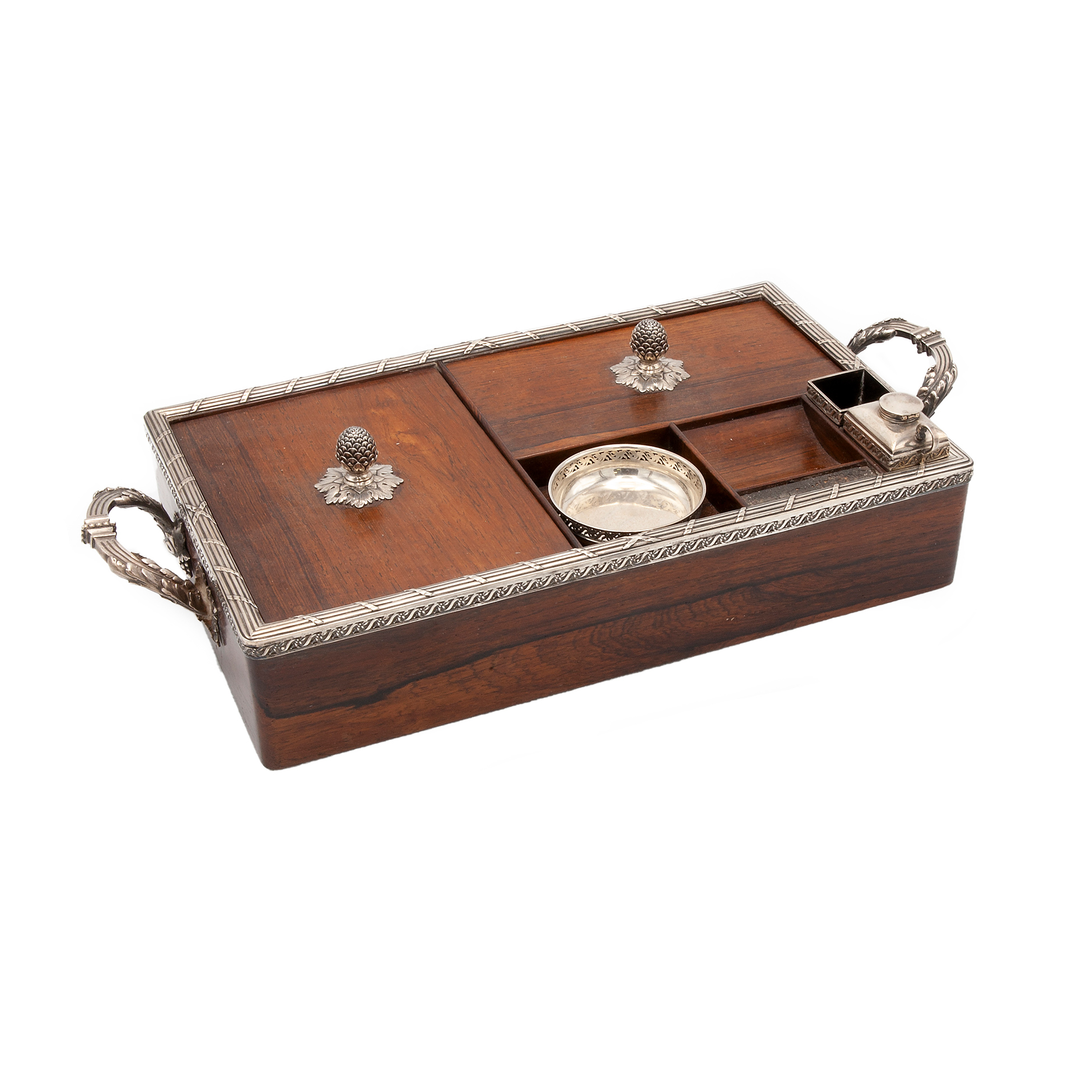 Scatola porta fumo, Francia XIX secolo Scatola composta da due scompartimenti in legno con coperchi dotati di presa in forma di pigna in argento e e tre elementi mobili in argento punzonati del peso complessivo di gr. 175 Dimensioni 9x39x18,5 cm.