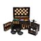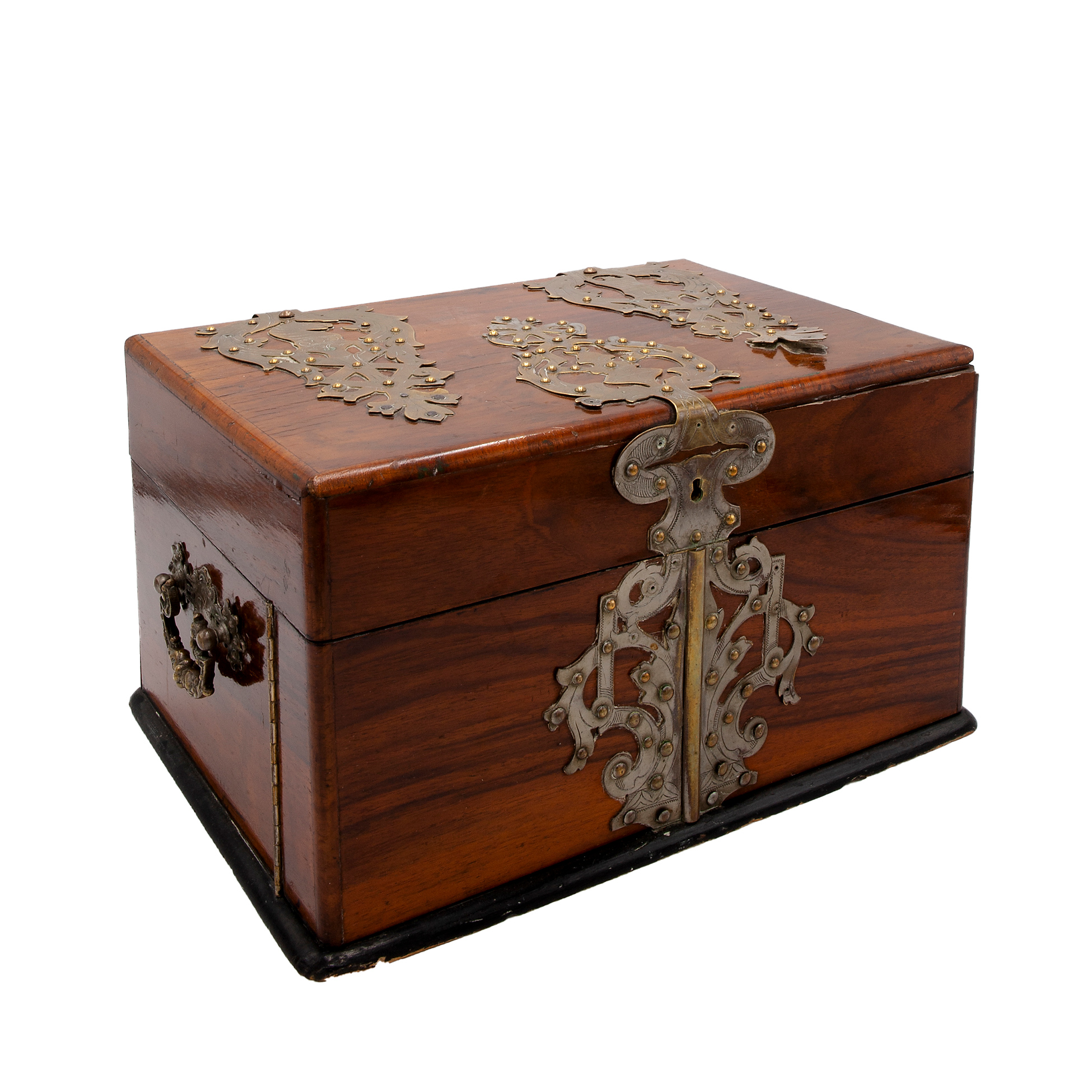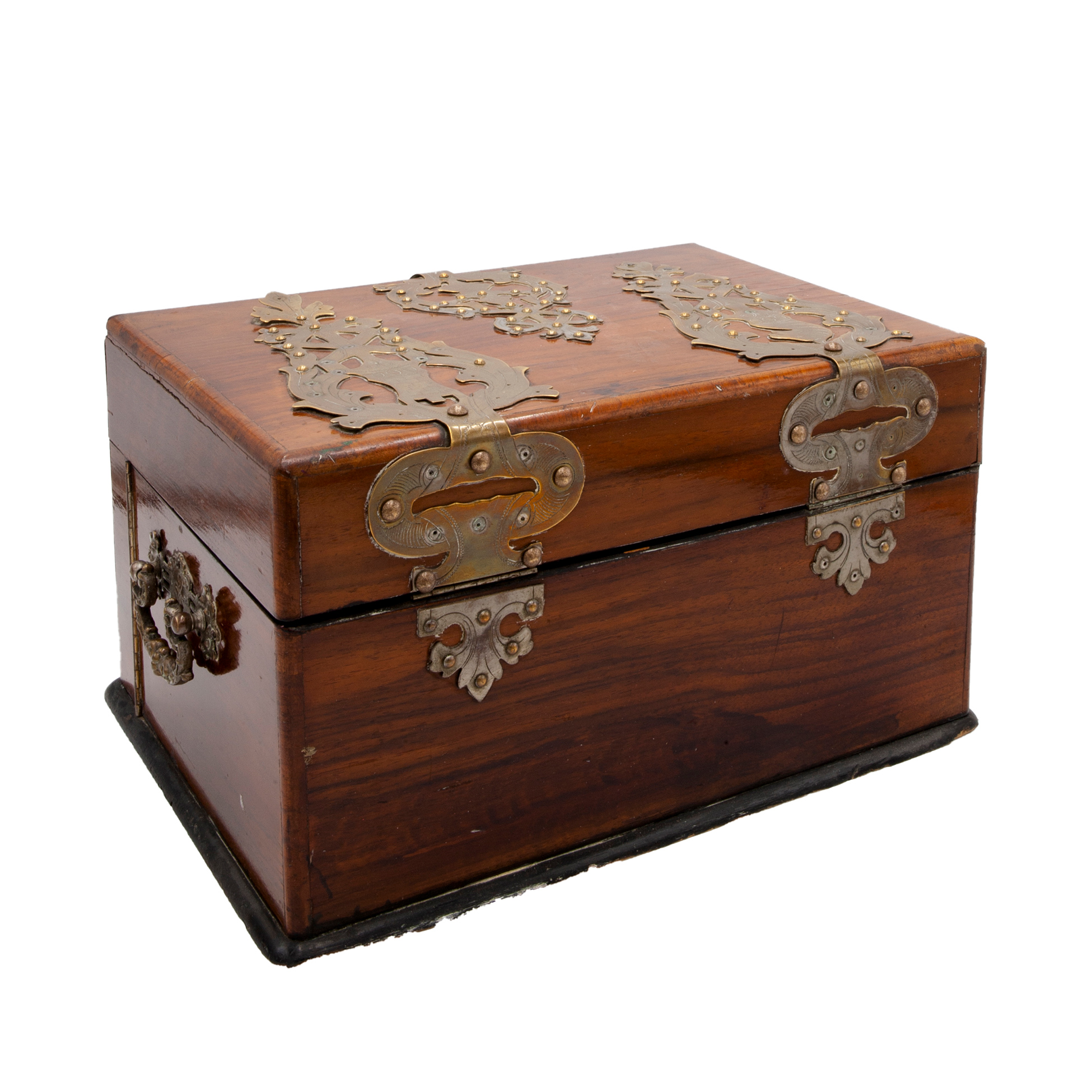 Scatola gioco del XIX secolo Grande scatola in legno con inserti in metallo dorato, comprendenti un set per il gioco di carte, scacchi e domino. Presenti difetti e mancanze, manca un alfiere nei bianchi e 1 alfiere, una torre e un pedone tra i neri Dime