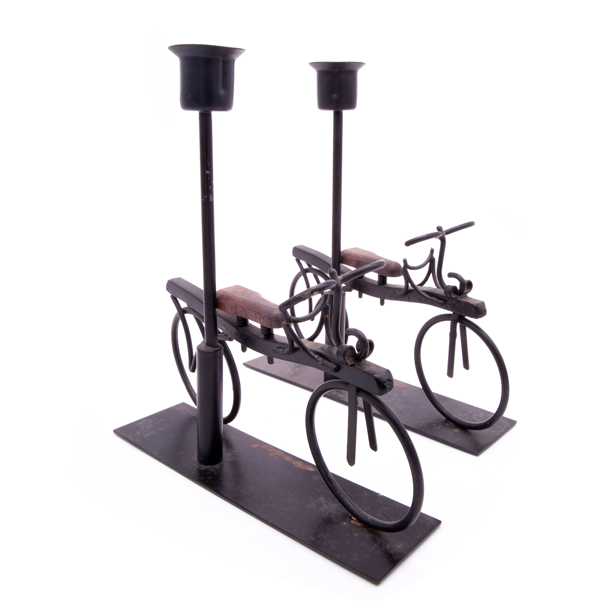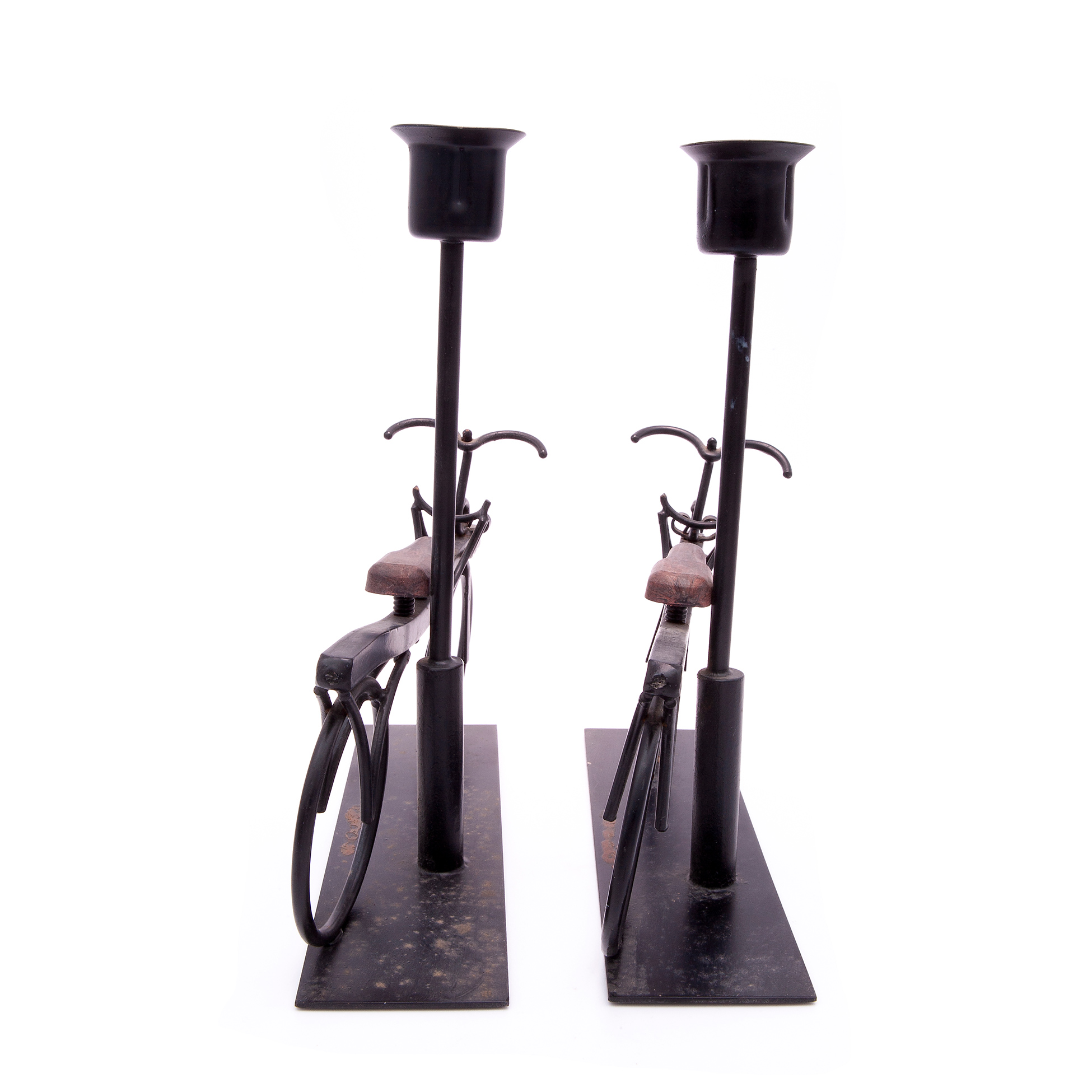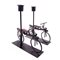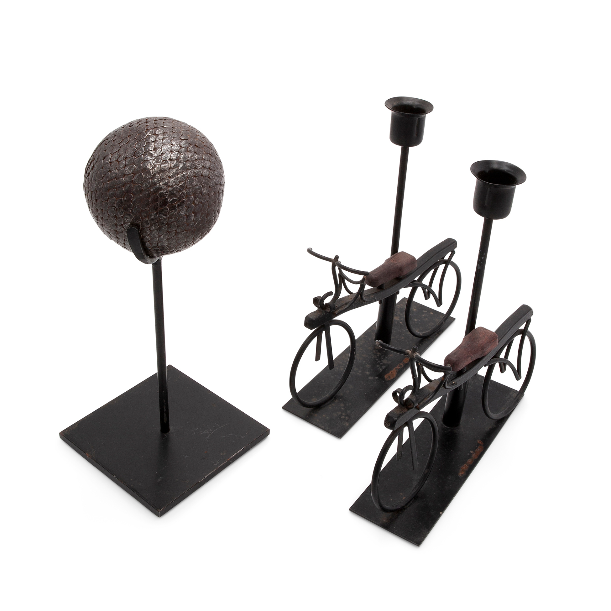 Gruppo di tre elementi da tavola in metallo Set composto da una scultura metallica in forma di sfera con supporto e una coppia di portacandela in metallo e legno in forma di bicicletta Dimensioni scultura 23.5x10x10, portacandela 20x19x5 cm. cad.