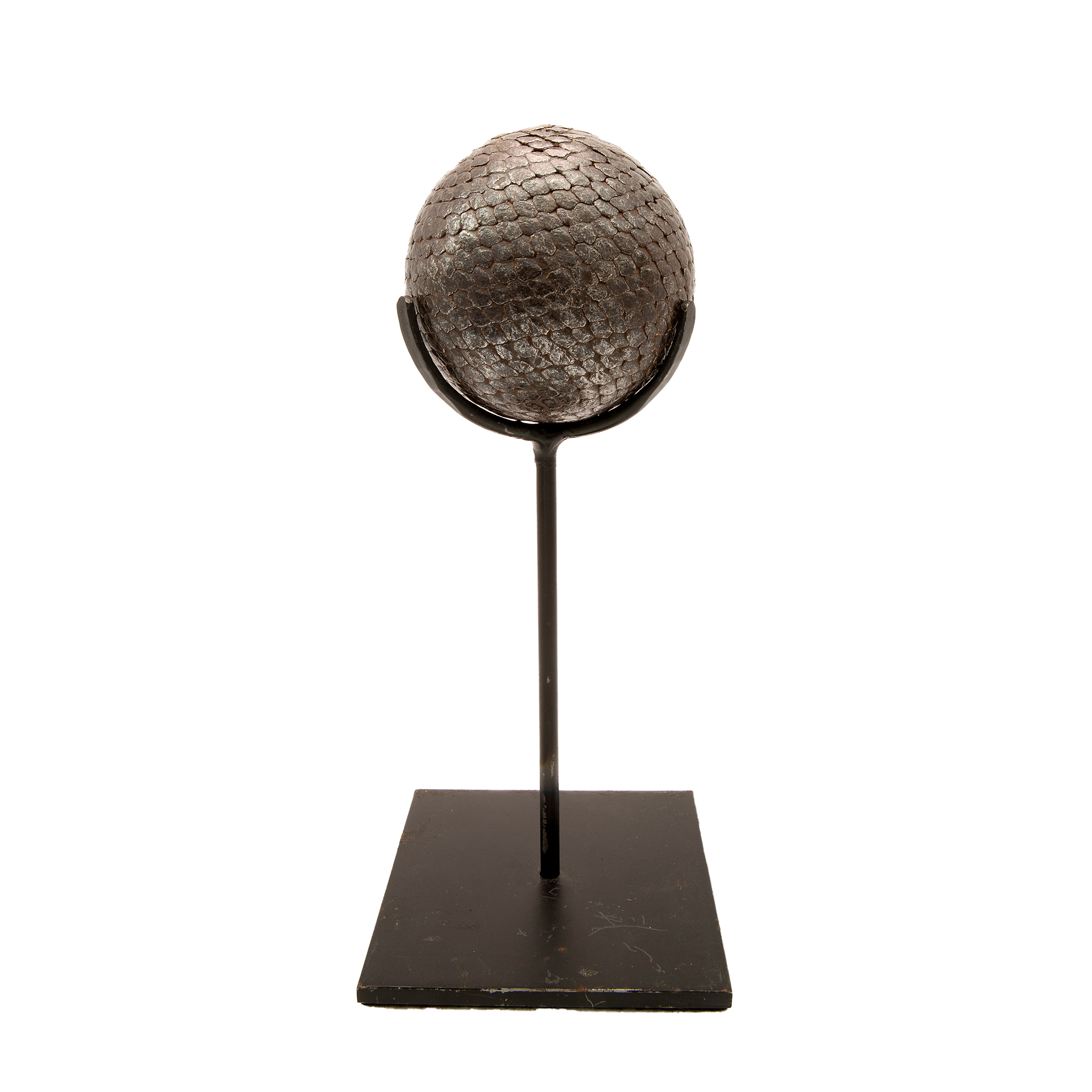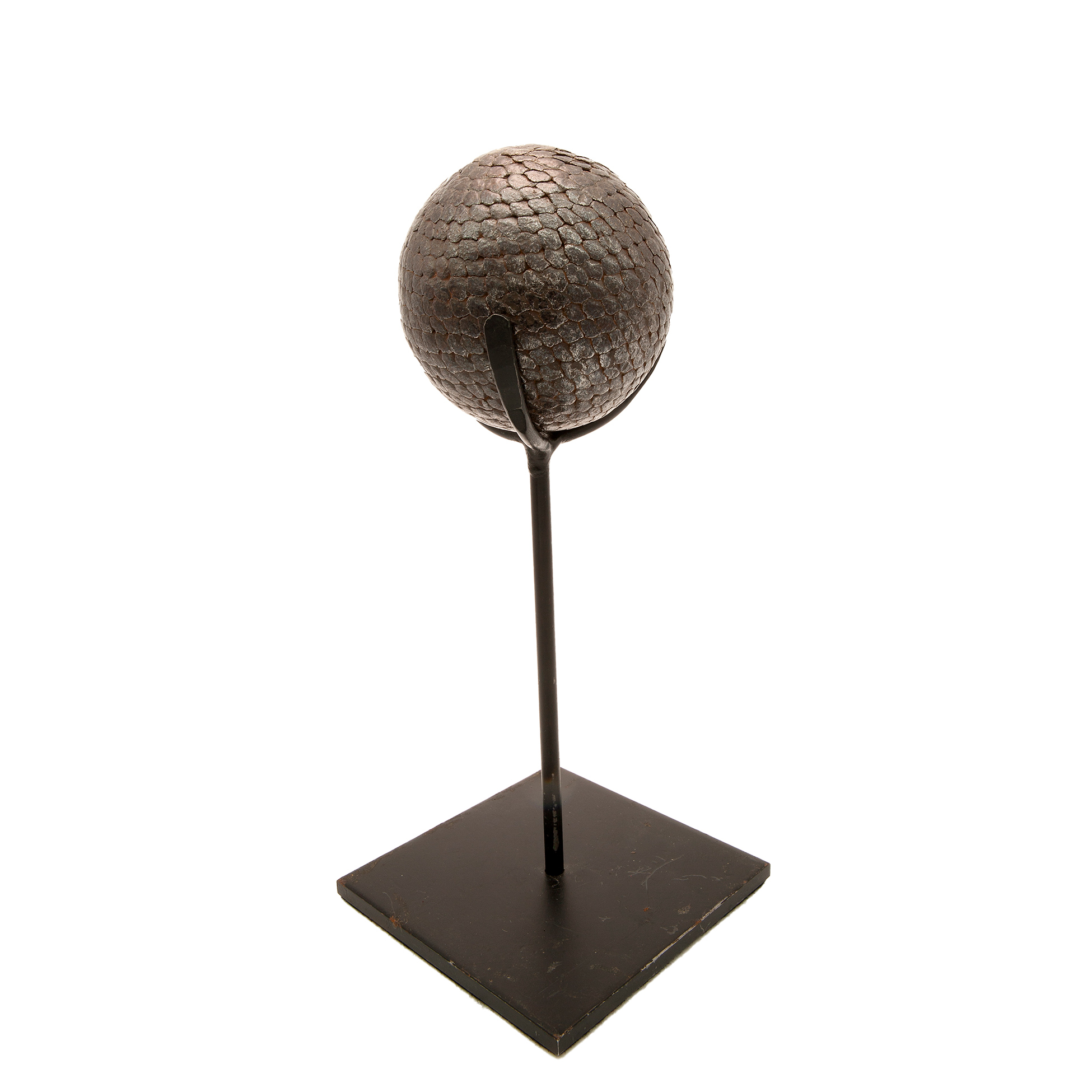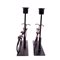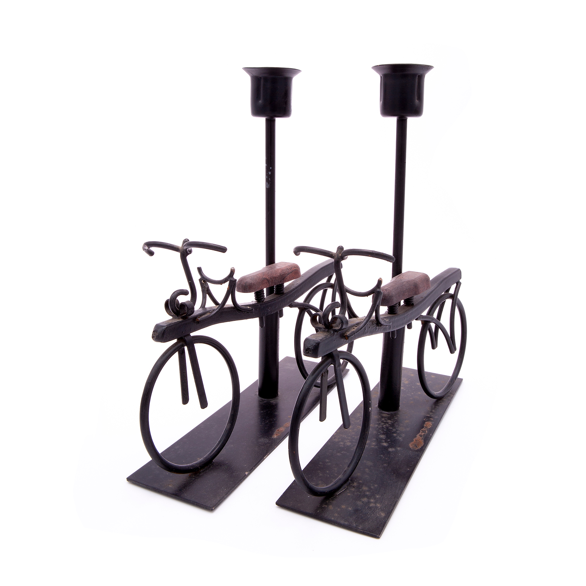 Gruppo di tre elementi da tavola in metallo Set composto da una scultura metallica in forma di sfera con supporto e una coppia di portacandela in metallo e legno in forma di bicicletta Dimensioni scultura 23.5x10x10, portacandela 20x19x5 cm. cad.