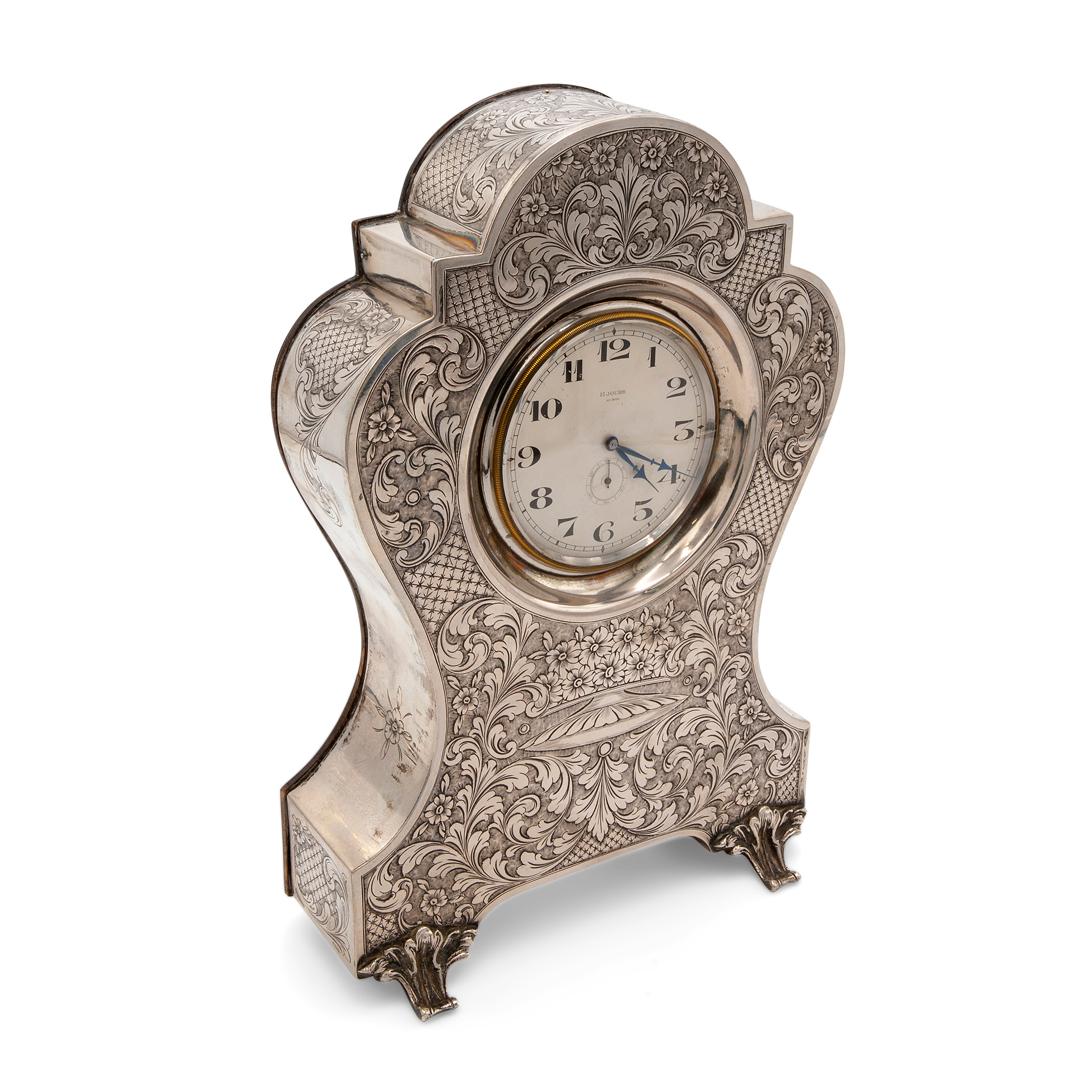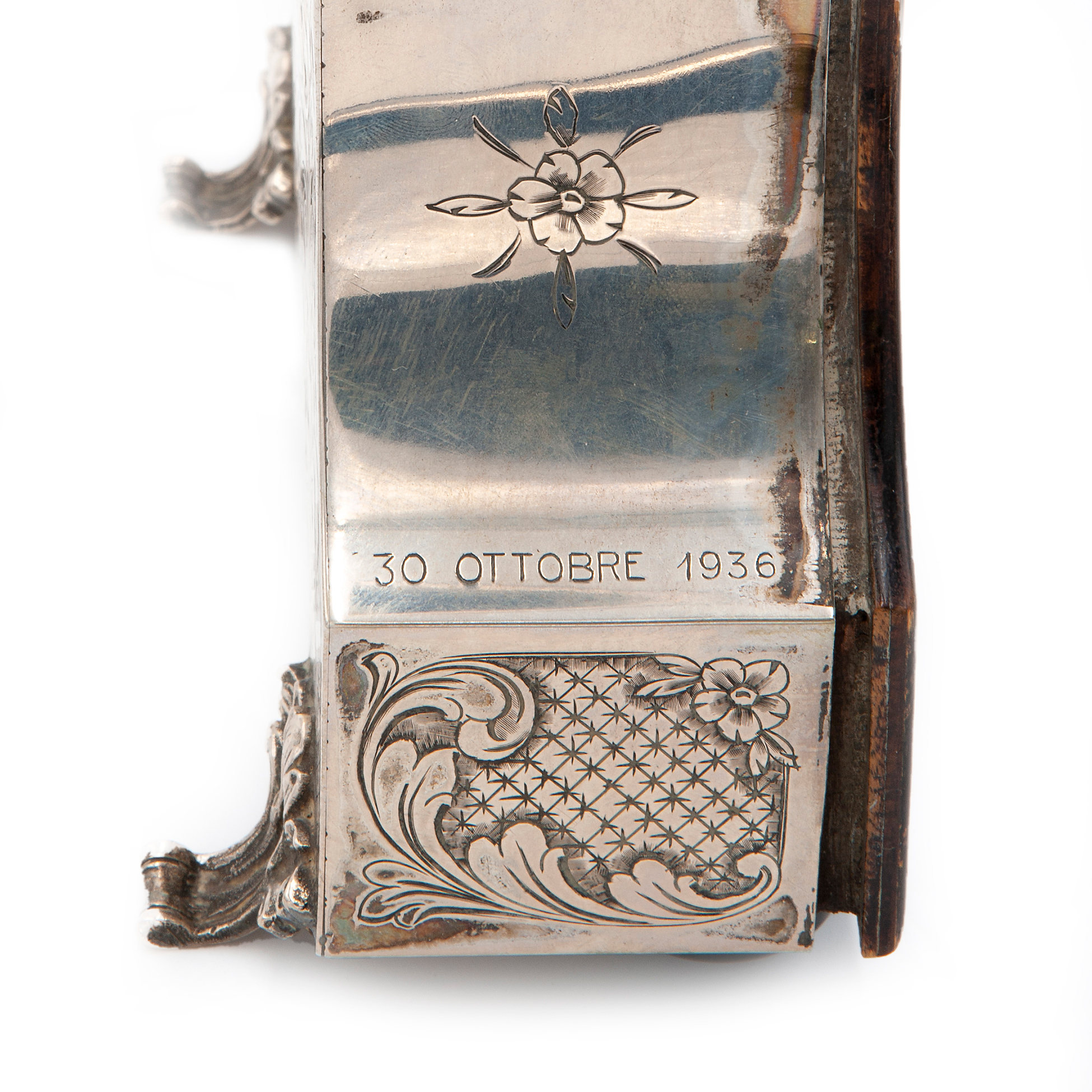 Orologio da tavolo Deco, 8 Jour Suisse Presente il punzone del titolo argento 900, reca su un lato l'iscrizione '30 Ottobre 1936', peso complessivo gr. 1215 Dimensioni 26x17x5 cm.
