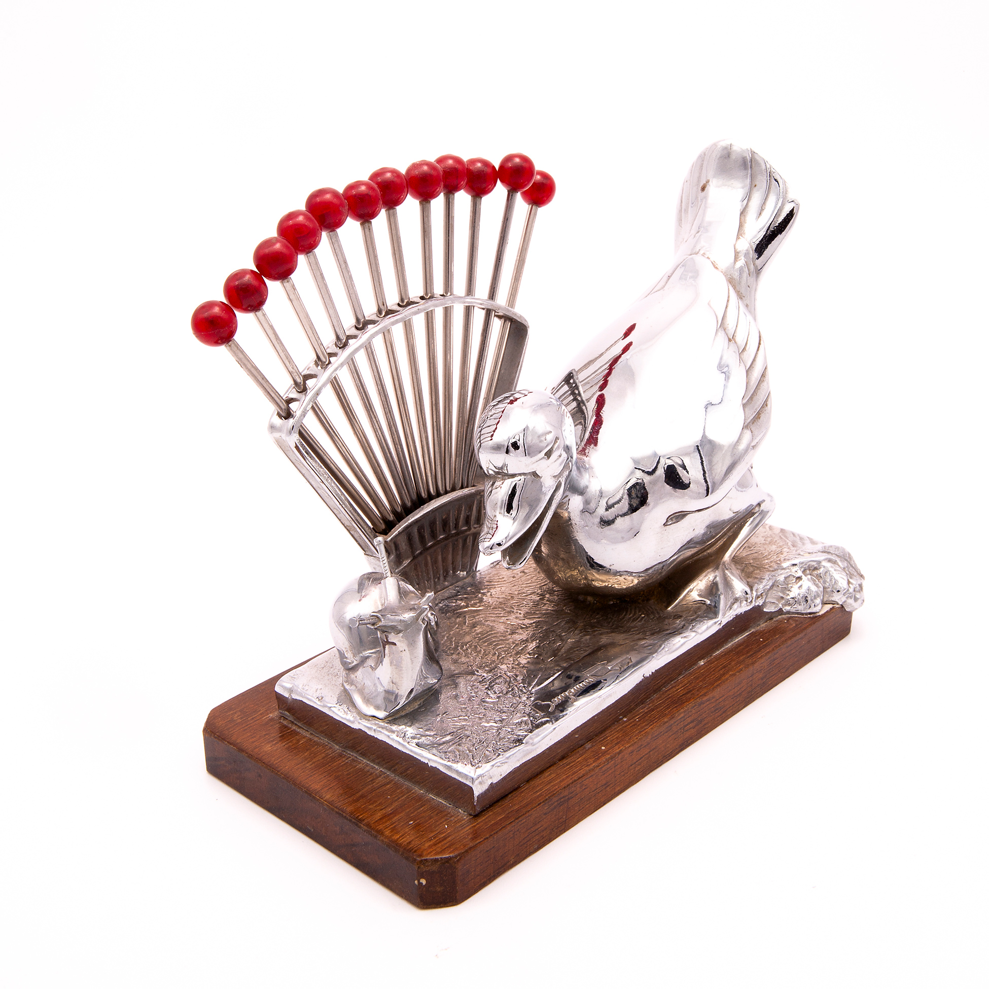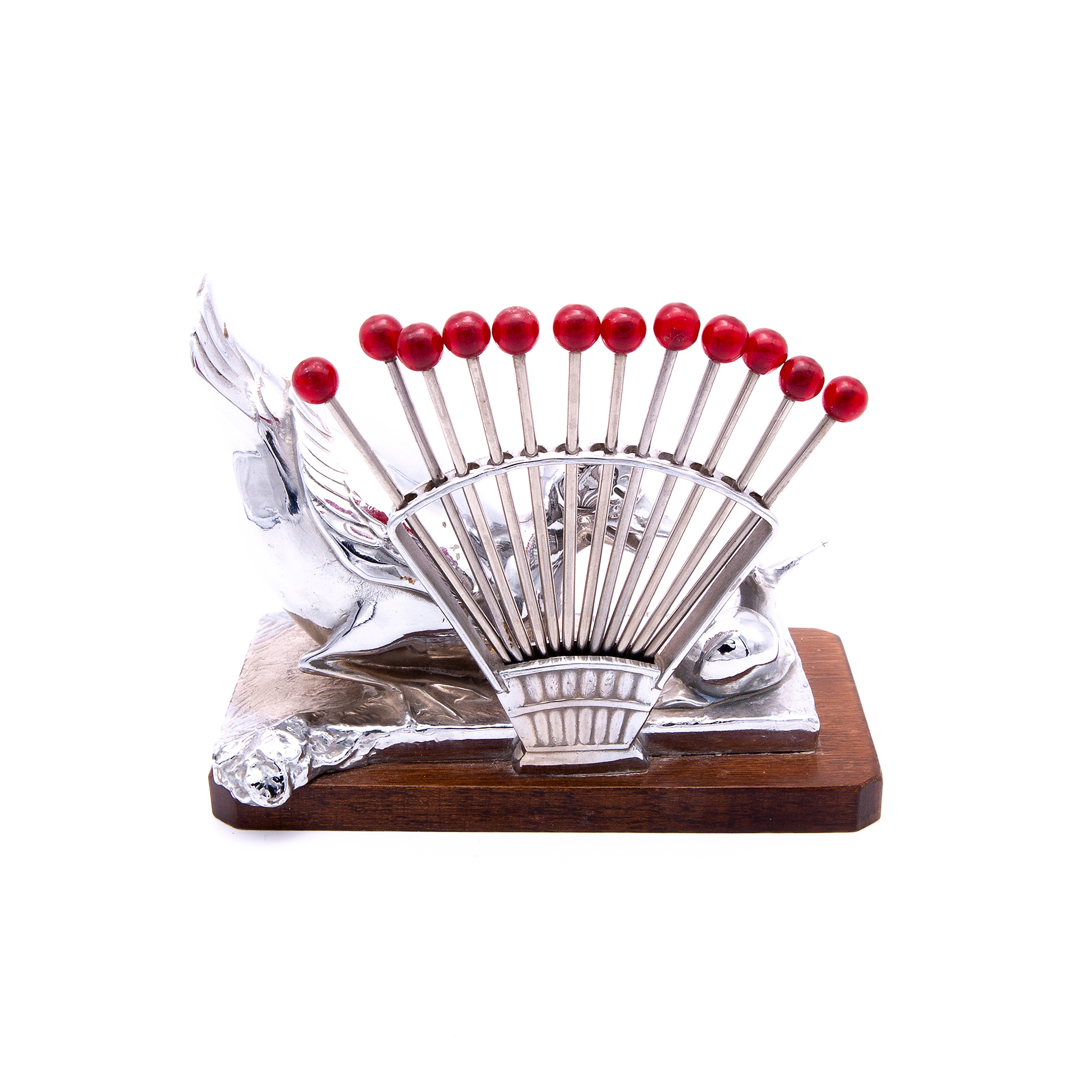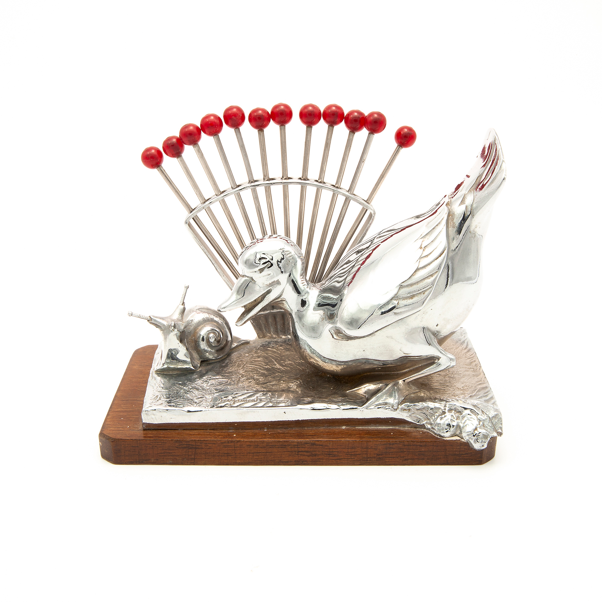 Piccolo set da tavola in argento Benjamin Rabier (1869-1939), Porta bastoncini per aperitivo in metallo su base in legno, due reggi carne in argento 'presente marchio Ricci Argentieri Italy 925', gr. 250. Grattugia per noce moscata in argento di fine Set