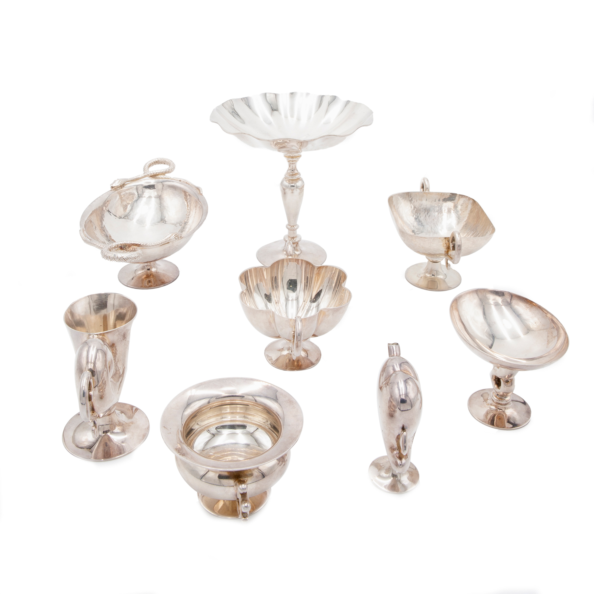 Gruppo di otto eleganti elementi in argento sterling, Pampaloni Firenze Punzone identificante la manifattura Pampaloni e il titolo dell'argento su ognuno degli otto pezzi, peso complessivo gr. 887 Dimensioni max 11,5x18x11,5 cm.