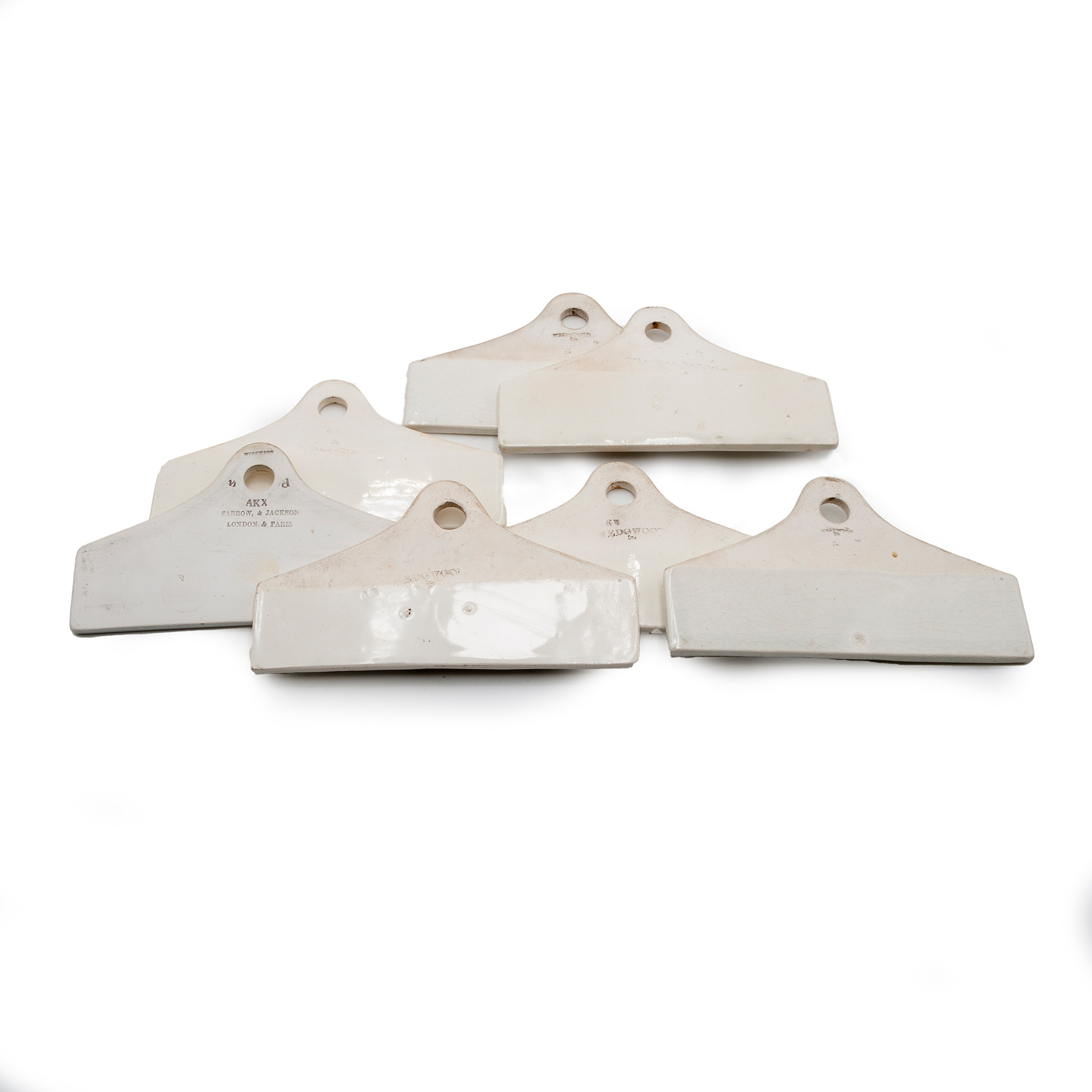 Set di etichette da liquore in porcellana Wedgewood Sette antiche etichette in porcellana dipinta, recanti i timbri della manifattura inglese Charles Farrow London, Wedgewood Dimensioni 8x14,5 cm.