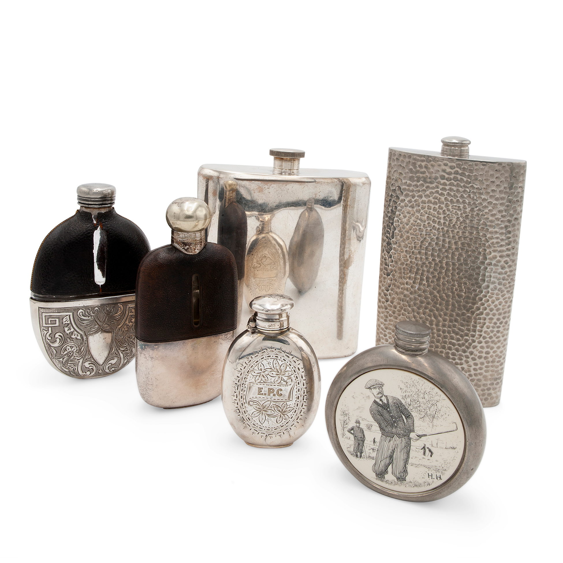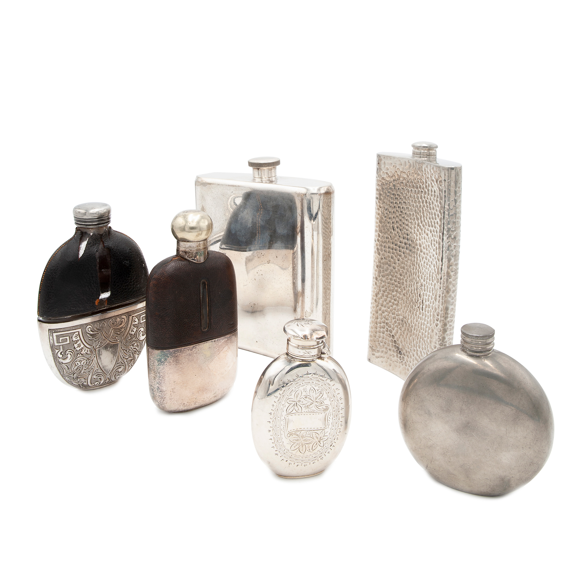 Lotto di sei fiasche in metallo argentato Gruppo di sei fiasche in vetro, metallo argentato e pelle, con decorazioni a sbalzo, incise o con corpo a superfice liscia. Dimensioni max 18x14x4,5 cm.