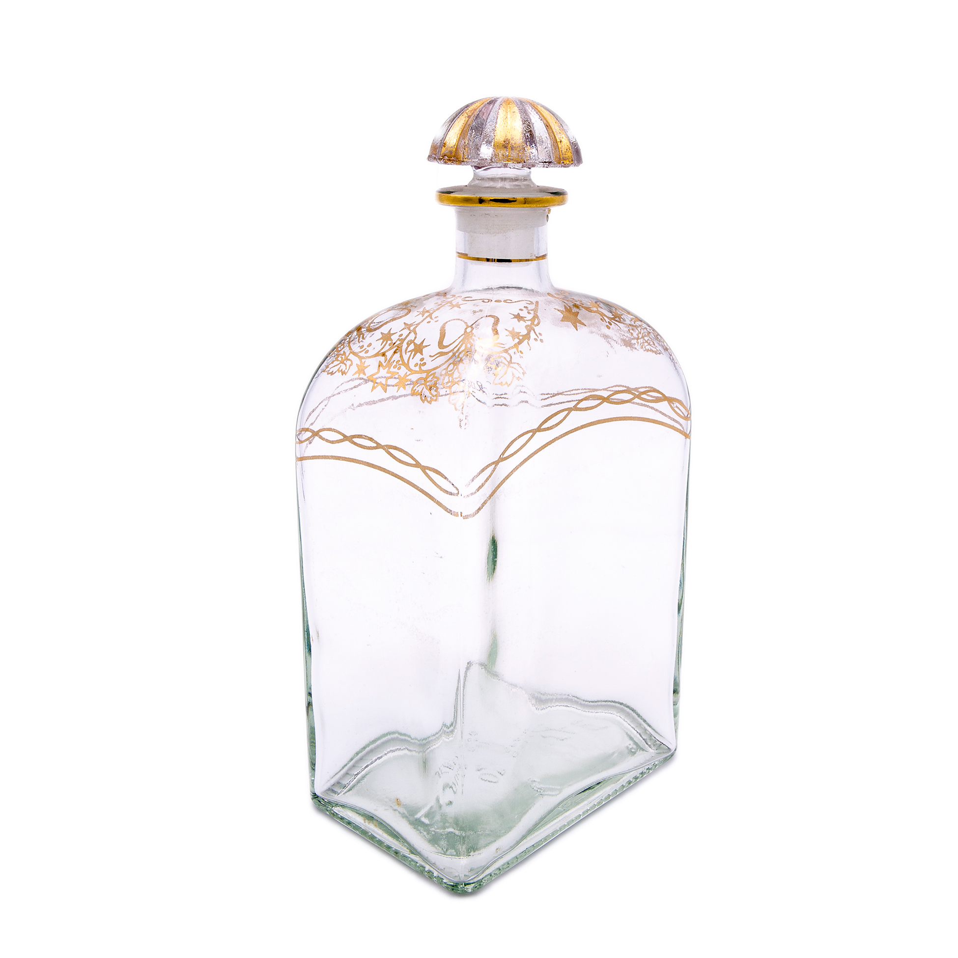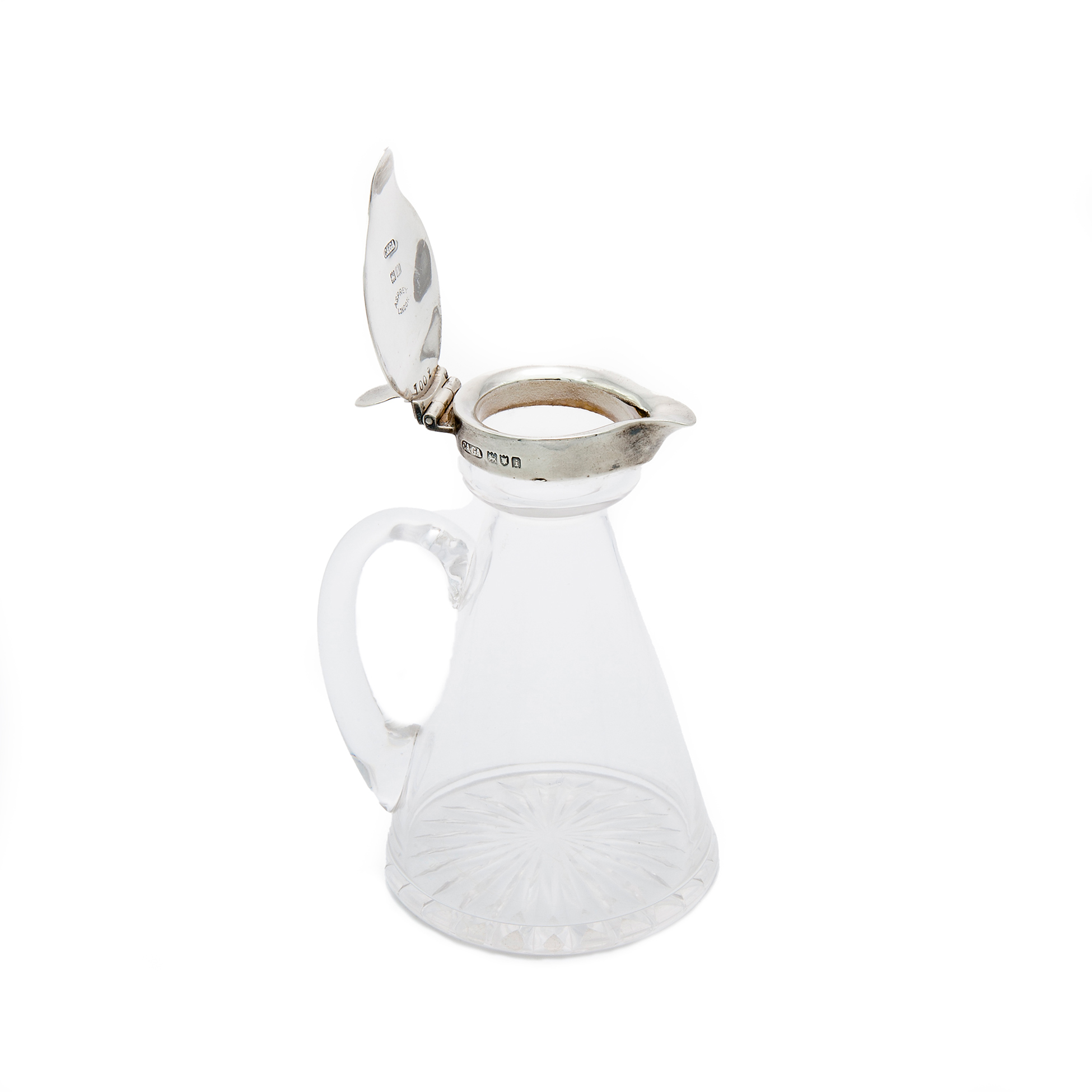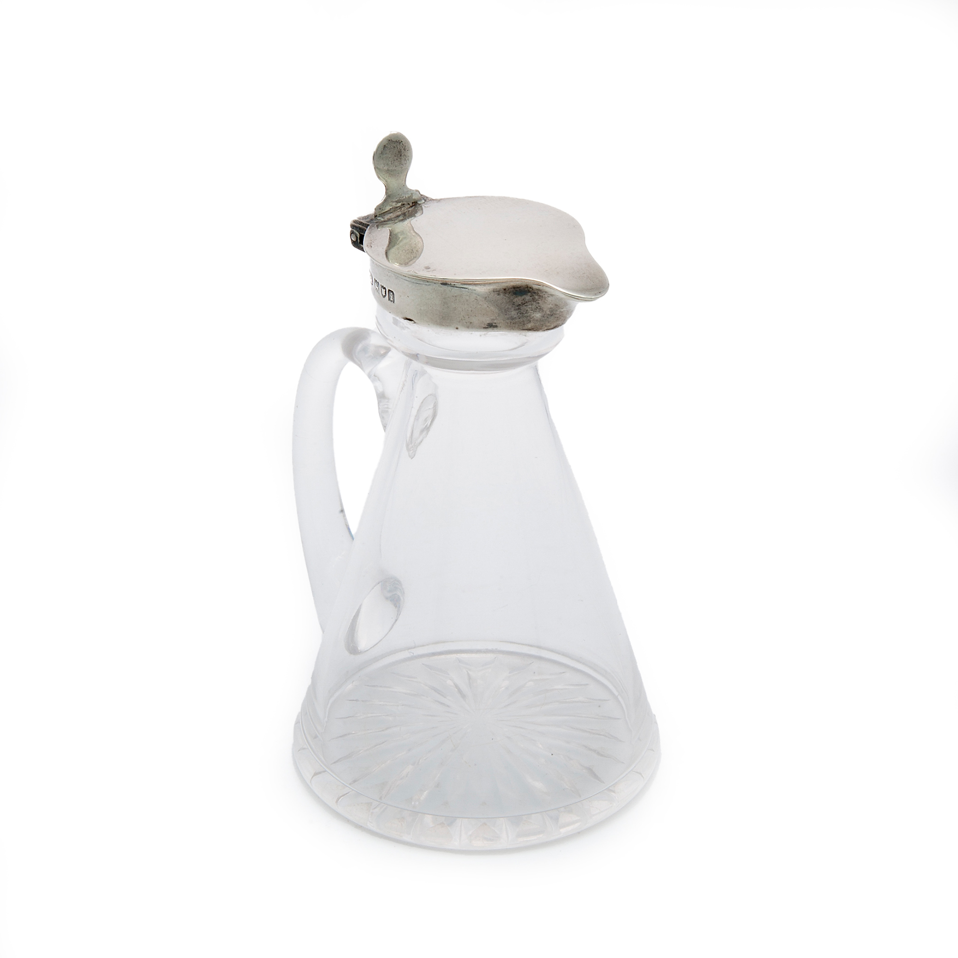 Set di eleganti flaconi in vetro Gruppo composto da: bottiglia da liquore in vetro, riporta sul fondo la scritta in rilievo 'Liquor Bottle Jerez Spain - CR'. Piccola caraffa in vetro e argento, Londra 1924 circa; Presente marchio 'Asprey London - 7002' a