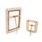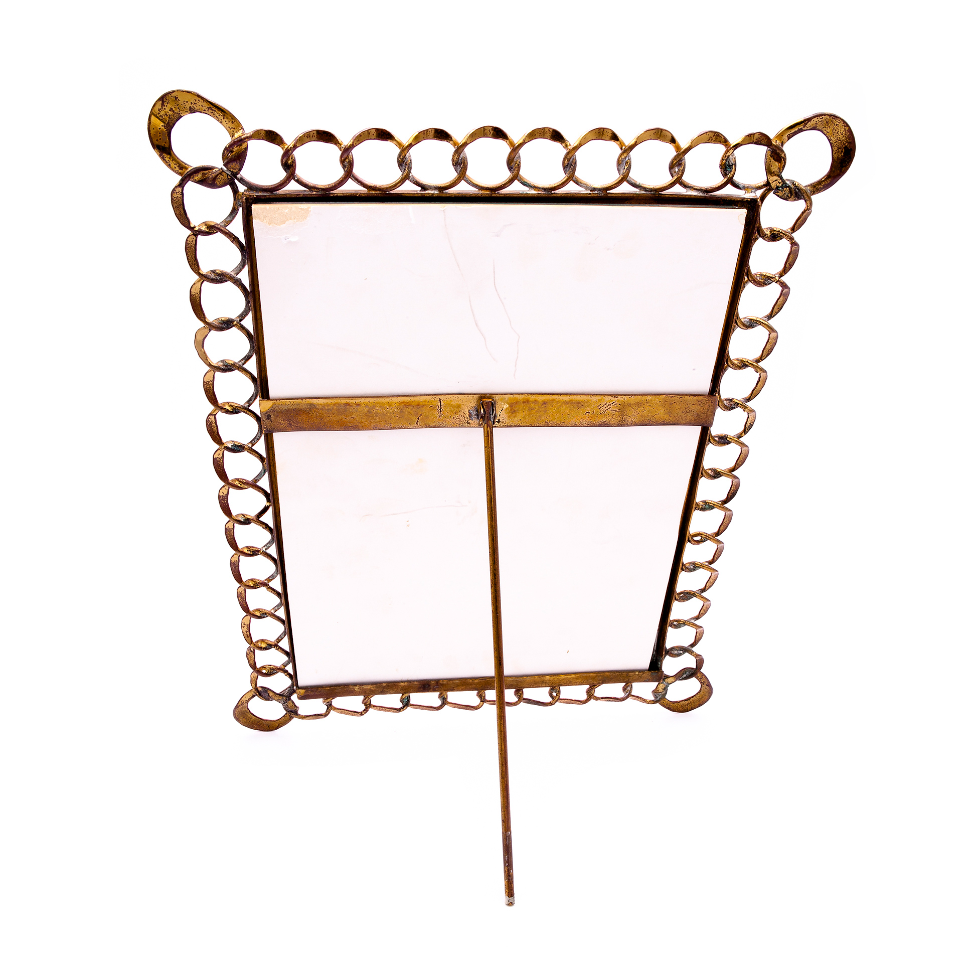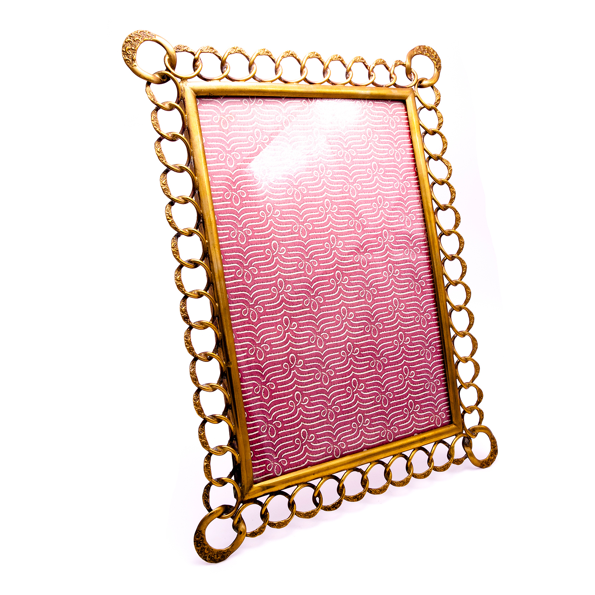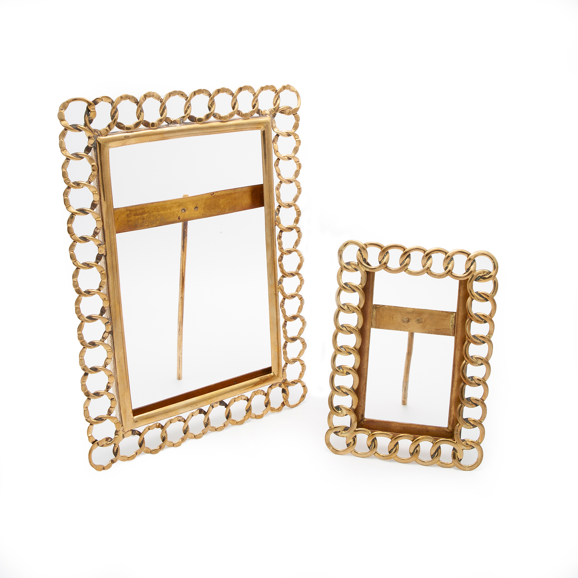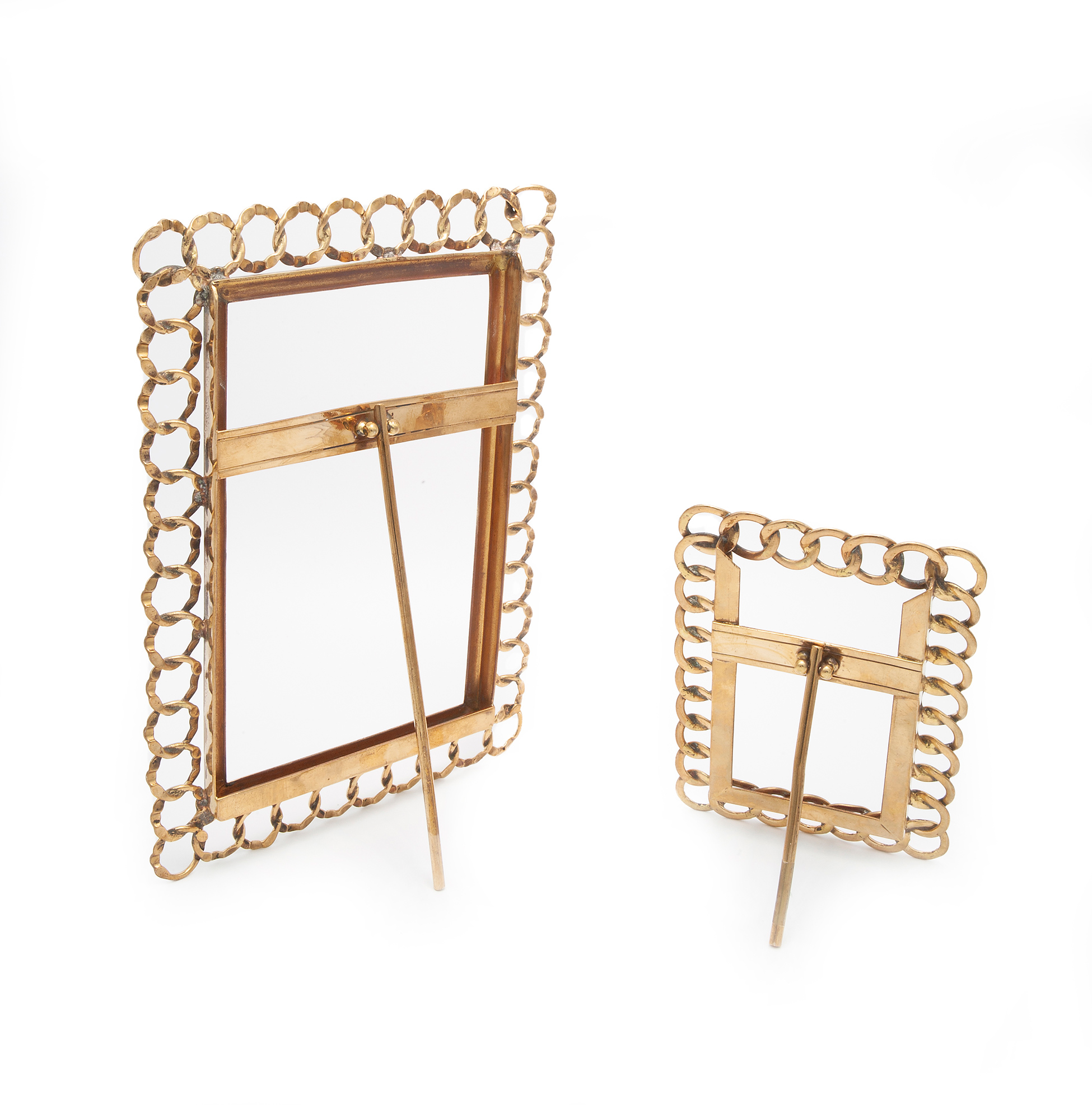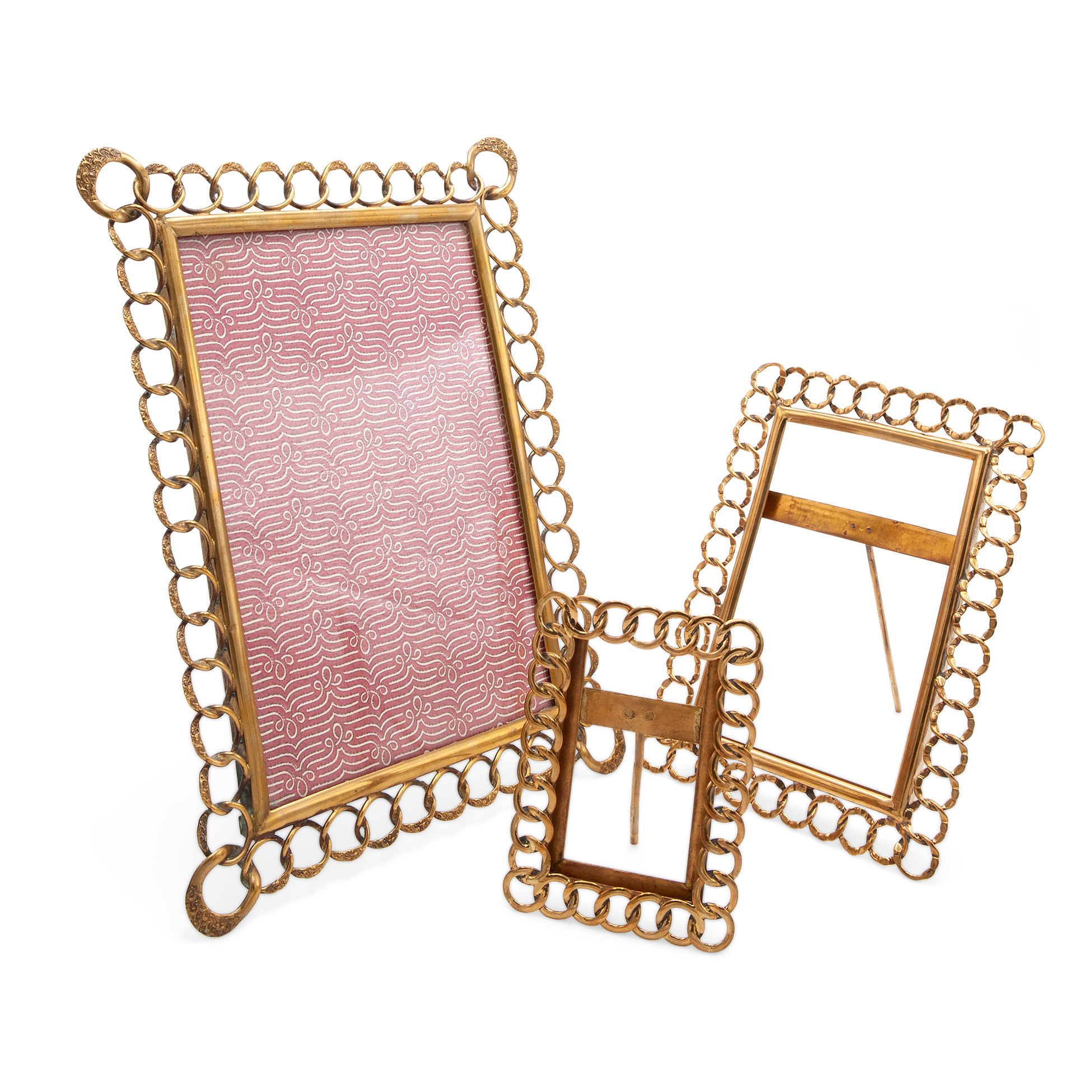 Tre cornici portafoto vintage con catena Interamente manufatte in metallo dorato, solo la cornice più grande è dotata di fondo e vetro Dimensioni rispettivamente 32x24, 21x15 e 13x9,5 cm.