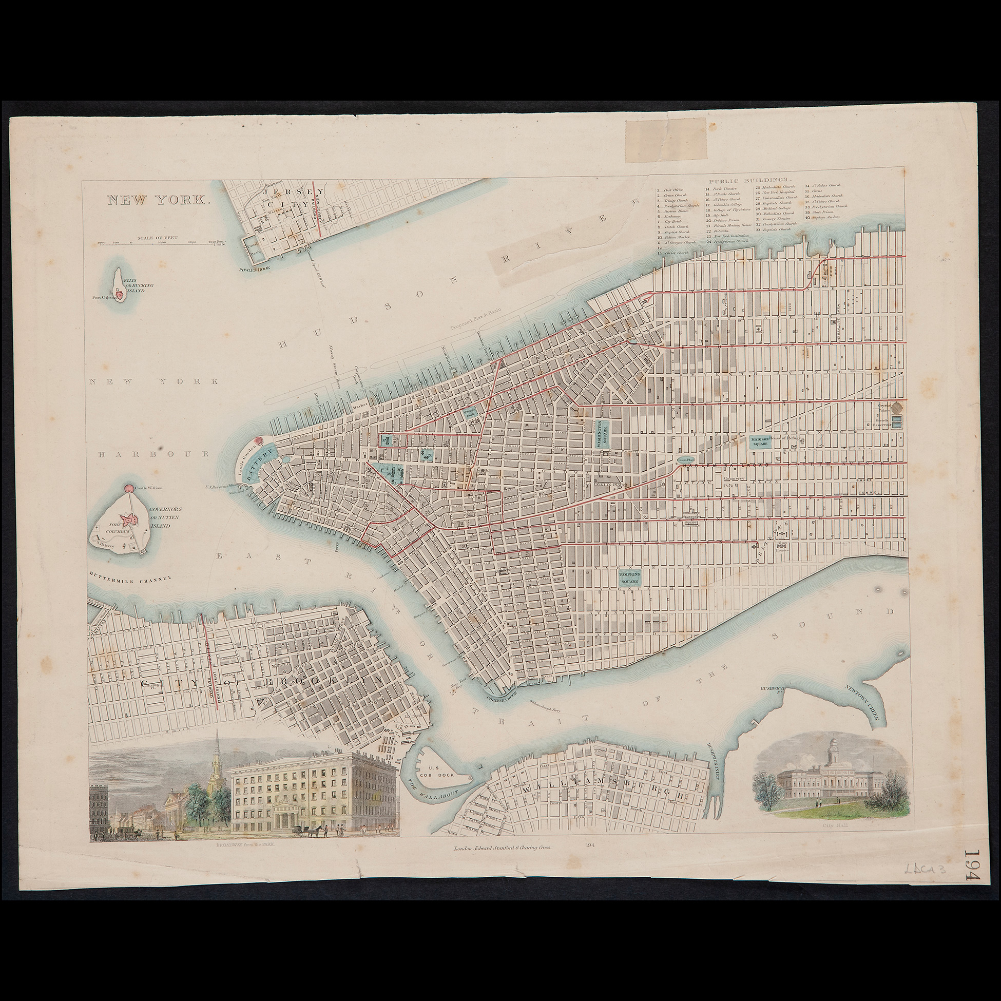 Carta geografica di New York, Londra XIX secolo Litografia probabilmente tratta da un disegno dell'architetto inglese William Barnard Clarke (1806–1865), reca in calce l'iscrizione 'London, Edward Stanford 6 Charing Cross', presenti difetti, priva di cor