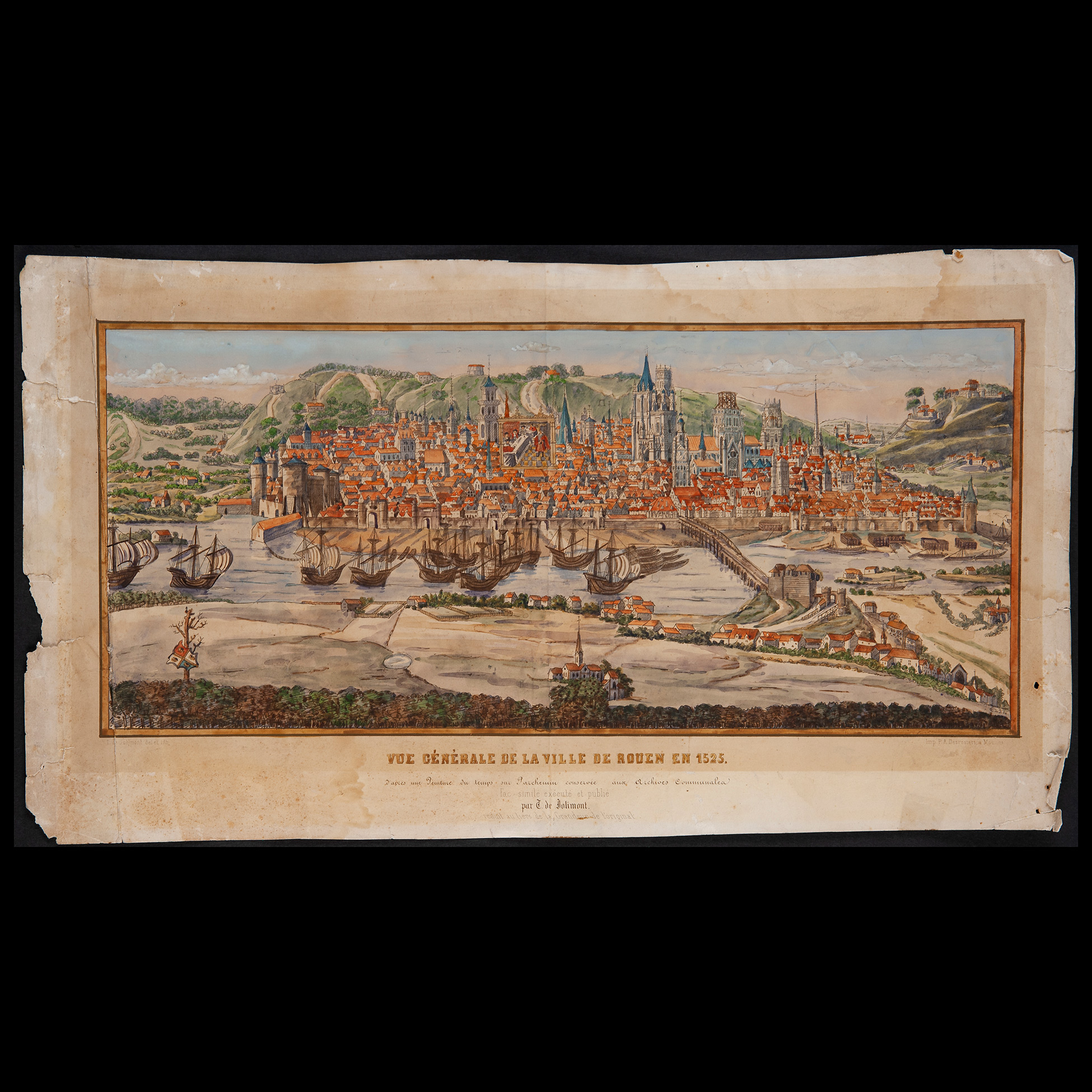 T. de Johmont, 'Vue Générale de la Ville de Rouen en 1525', Francia fine del XVIII secolo Incisione finemente acquerellata, reca in calce l'iscrizione ' T. de Johmont delet lith - d'apres une peinture du temps sur Parchemin conservée aux Archives Communa