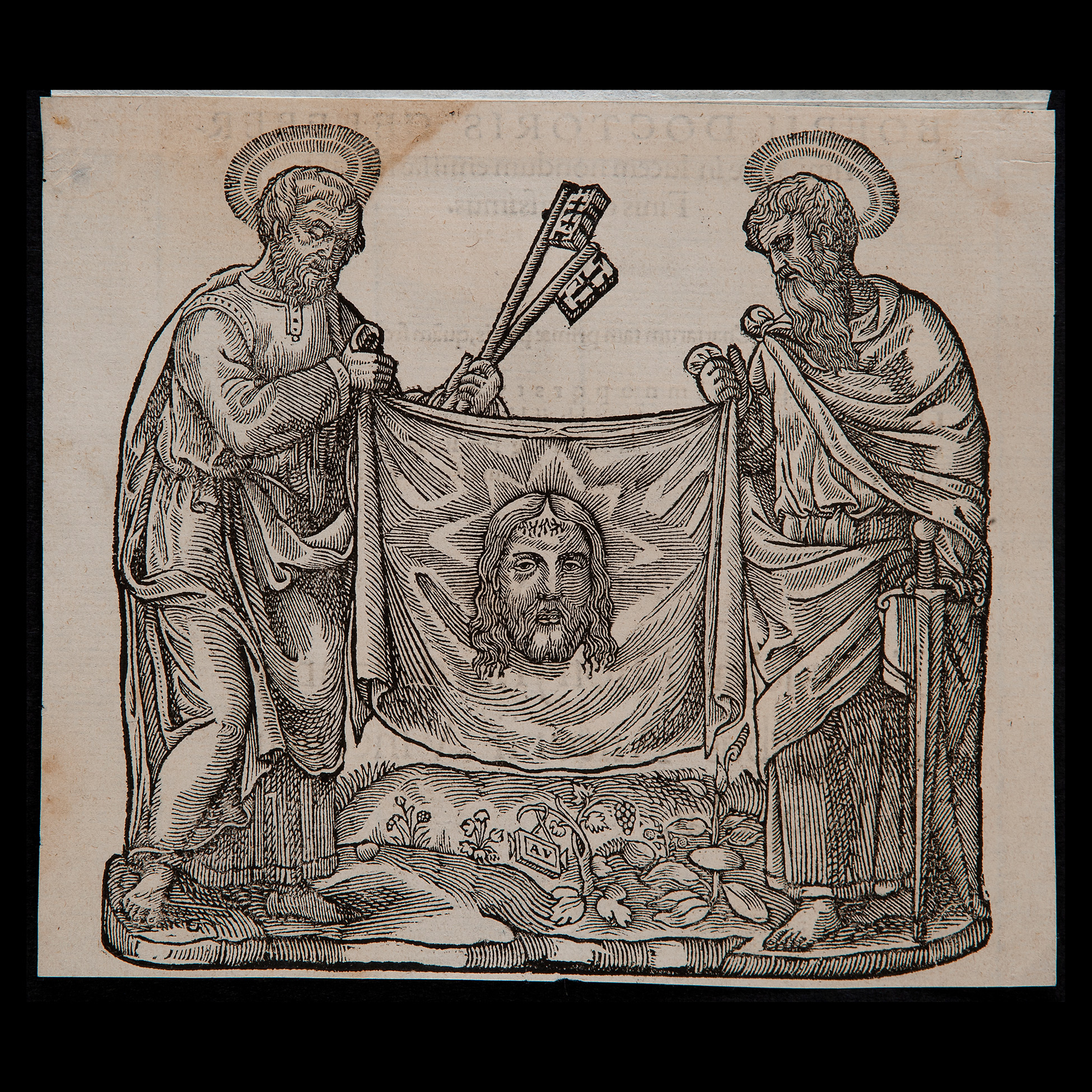 Agostino Veneto De Musis (Venezia 1490 - 1540), Antica xilografia raffigurante i santi Pietro e Paolo che recano il Velo della Veronica