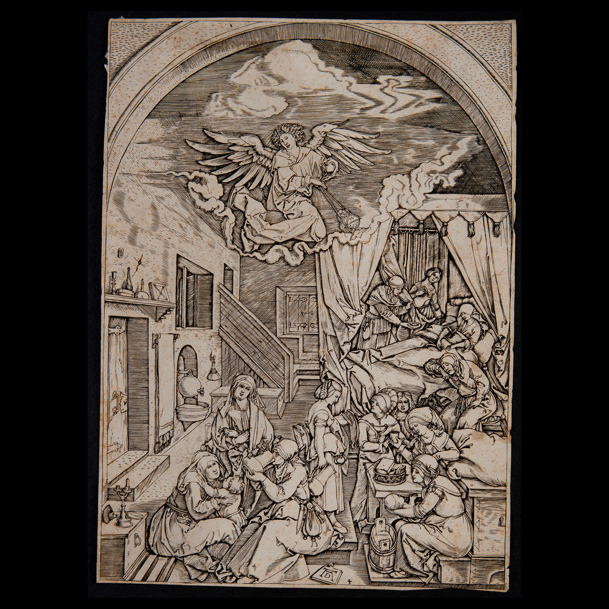 Marcantonio Raimondi (Molinella ca. 1480 – Bologna 1534), da, La nascita della Vergine Incisione su carta vergellata e filigranata tratta dalla serie 'La vita della Vergine' di Albrecht Dürer (1471-1528). Presente monogramma AD in basso al centro; presen