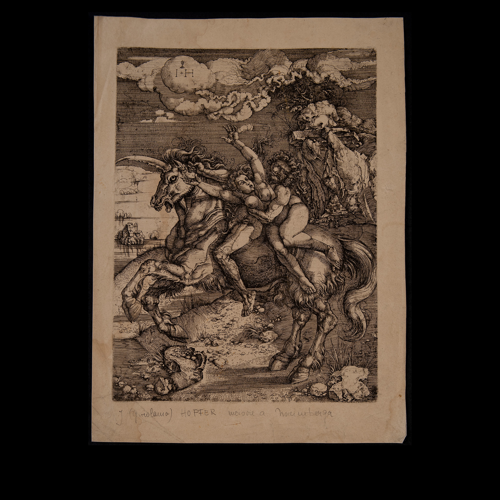 Hieronymus Hopfer (Augusta ca. 1500 – Norimberga ca. 1550), Ratto di Proserpina su un unicorno, 1540 Nota incisione dell'artista fiammingo tratta dalla celebre opera di Dürer, reca in alto a sinistra il monogramma dell'artista 'I H'. Presenti difetti, pr