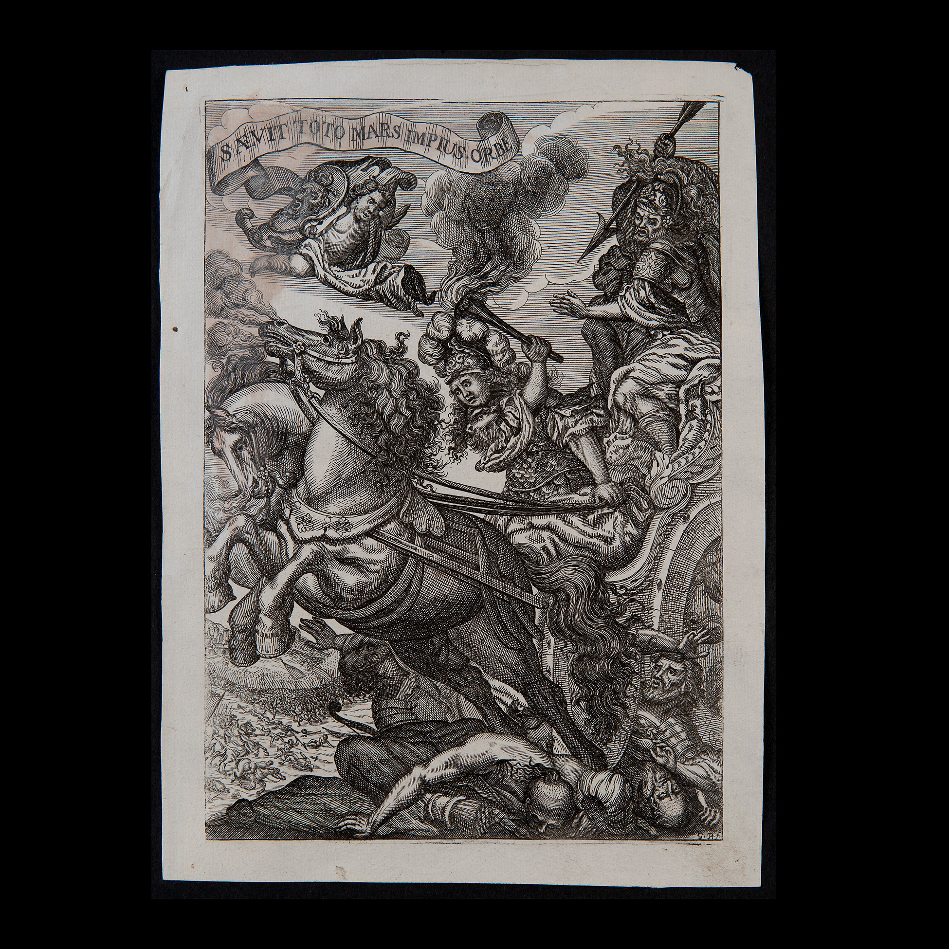 Importante incisione raffigurante l'Allegoria della Guerra Reca l'iscrizione ' Saevit toto mars impius orbe', in basso a destra è presente il monogramma G.P.F.. Presenza di difetti, priva di cornice Incisione su rame, dimensioni 23,5x17,5 cm.