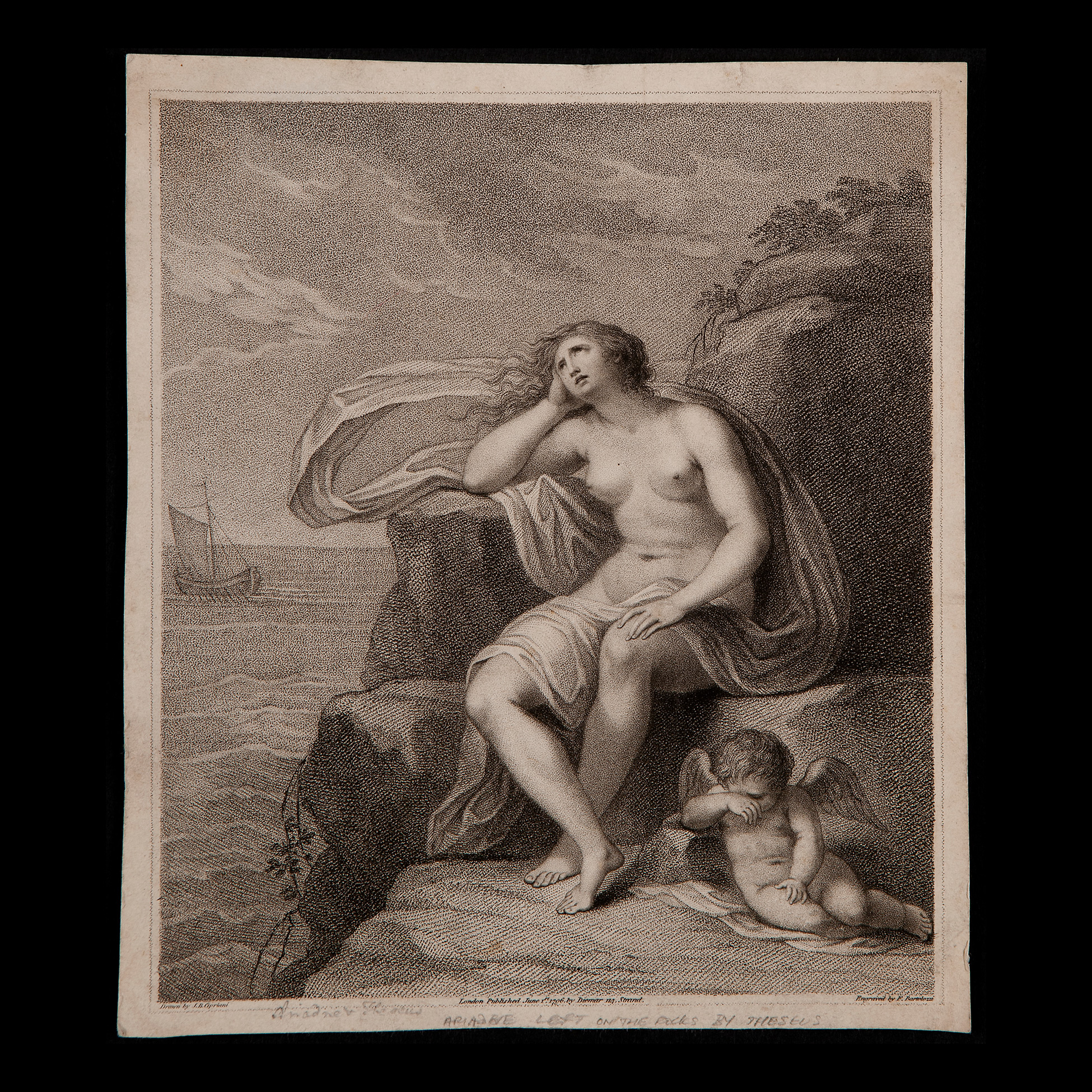 Francesco Bartolozzi (Firenze 1727 – Lisbona 1815), Arianna abbandonata sull'isola di Nasso, Italia seconda metà del XVIII secolo Incisione desunta dall'opera dell'artista fiorentino Giovanni Battista Cipriani, reca in calce l'iscrizione 'Drawn by J.B. C