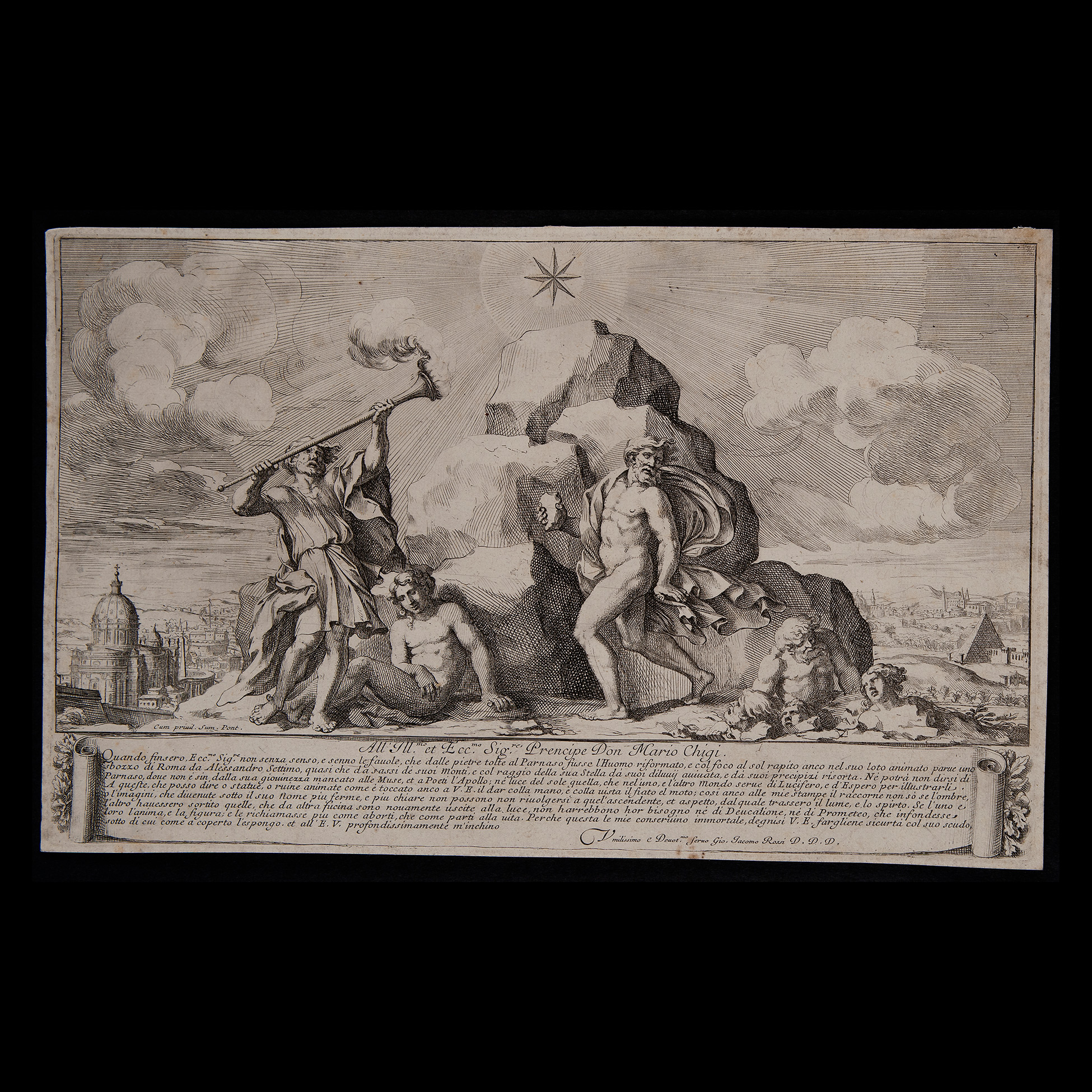 Giovanni Giacomo De Rossi (1627 – Roma 1691), Pregevole incisione raffigurante un'allegoria celebrativa per il Principe Don Mario Chigi, Roma seconda metà del XVII secolo Opera grafica realizzata su carta vergellata e filigrana. In basso presente un gra