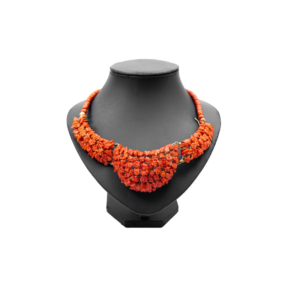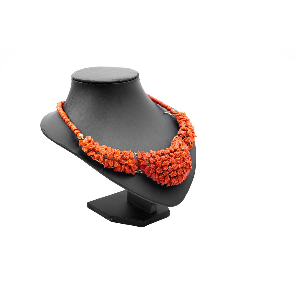 COLLANA in corallo lavorato a motivo floreale e fogliaceo, con girocollo in corallo taglio barilotto sfaccettato a degradare, montatura in metallo dorato (g. 94,00).