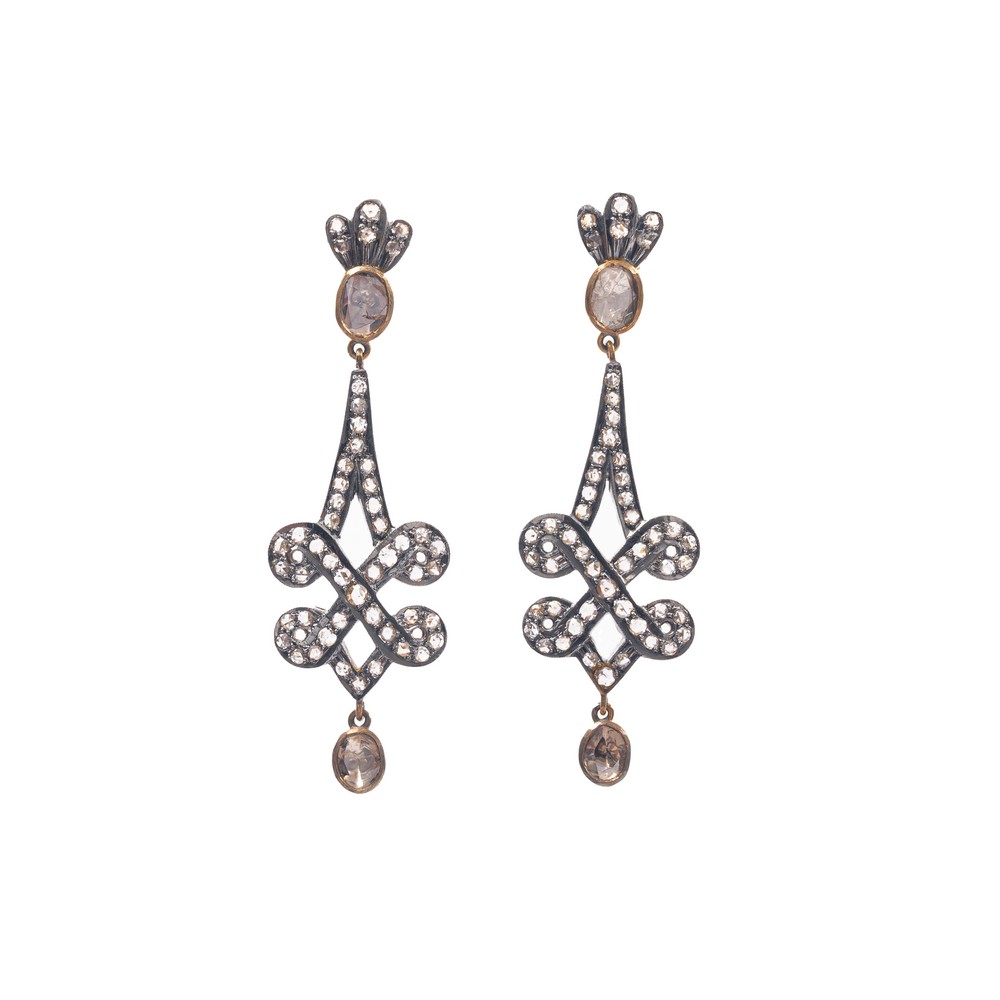 ORECCHINI in argento e oro giallo 12 KT con diamanti ct. 1,30 peso di stima e diamanti ovali taglio antico ct. 2,00 peso di stima (g. 12,80).