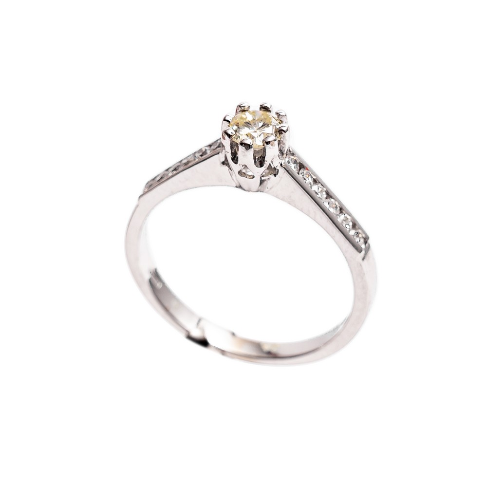 ANELLO in oro bianco 18 KT e diamanti taglio brillante ct. 0,15 H color VVS1 e diamante centrale taglio brillante ct. 0,30 J color VS2 (g. 3,00).