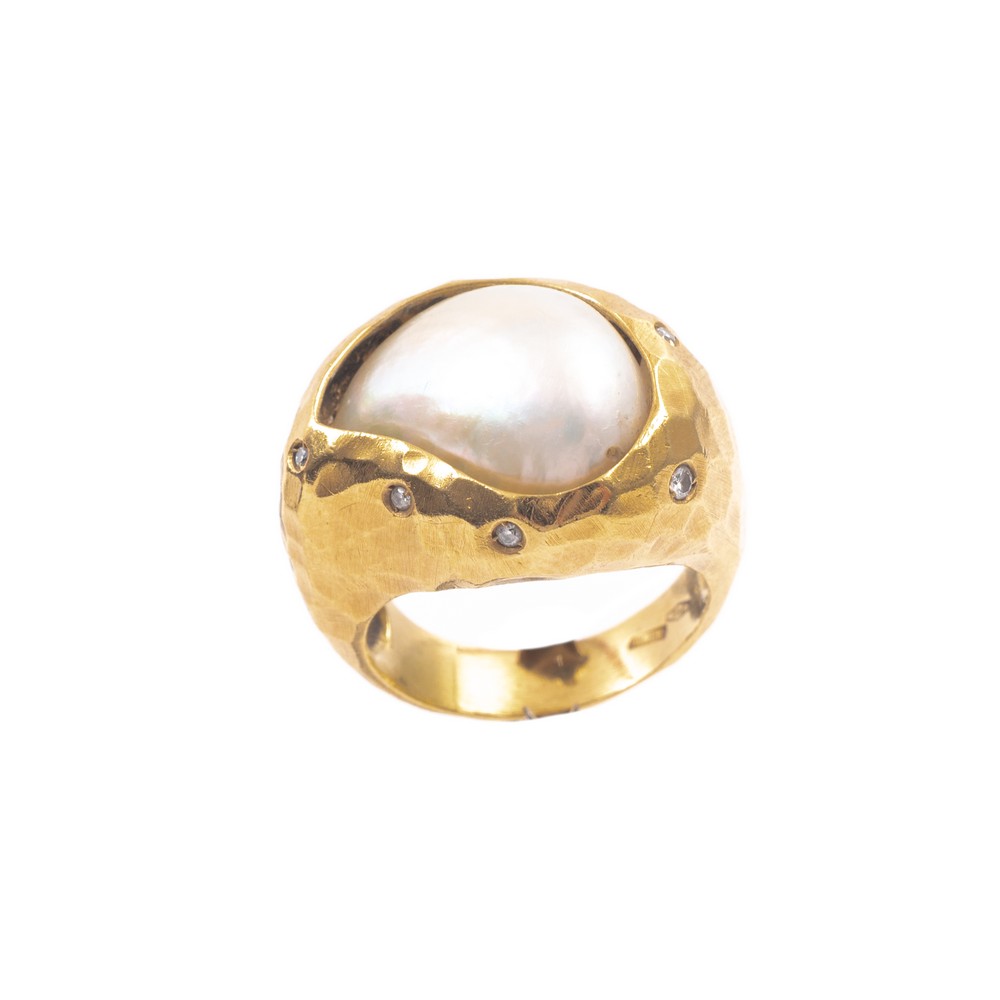 ANELLO in oro giallo 18 KT con perla di fiume e diamanti taglio huit/huit ct. 0,07 (g. 15,00).