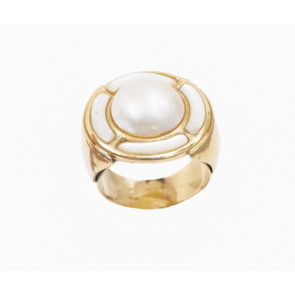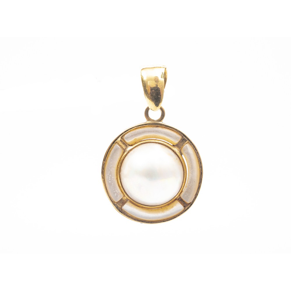 PARURE composta da anello e pendente in oro giallo 18 KT con perle mabè ed inserti di madreperla (g. 22.00).