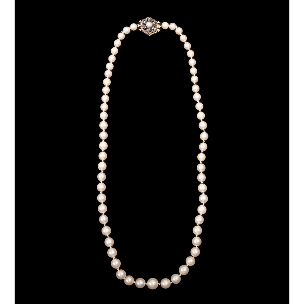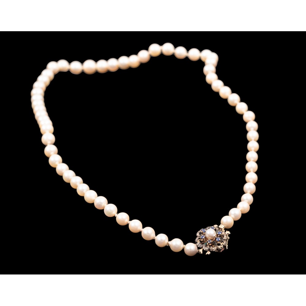COLLANA di perle coltivate Giappone, susta in oro giallo 18 KT con zaffiri ct. 0,10 (g. 41,60) .