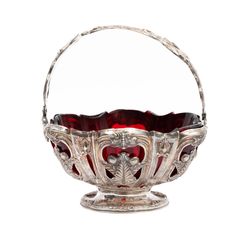CESTINO in argento sbalzato a motivo naturalistico con coppa in vetro rosso (g. 398) (sbeccature e usure).