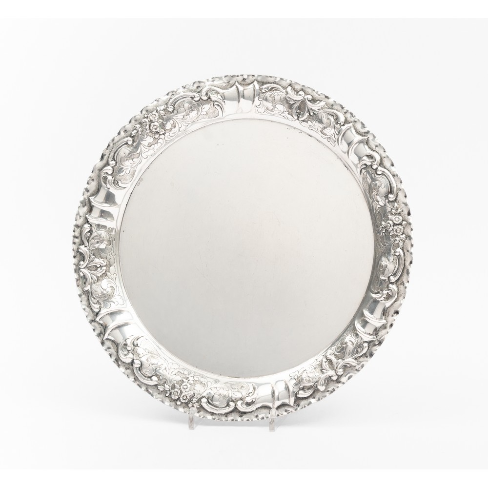VASSOIO tondo in argento con bordo sbalzato a motivo naturalistico. Argentiere Formusa Pietro- Palermo (g. 458).