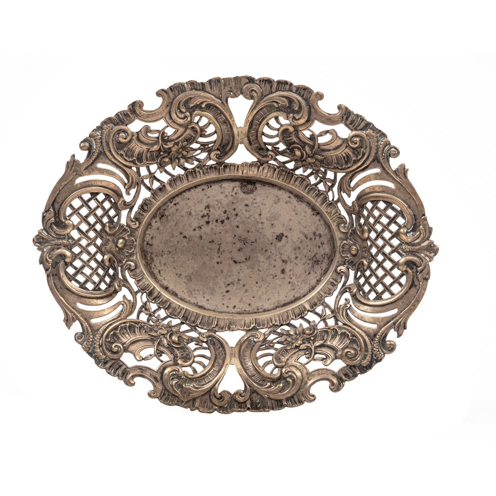 CENTROTAVOLA di forma ovale in argento con bordo sbalzato e traforato. Argentiere F. P. (g. 319).