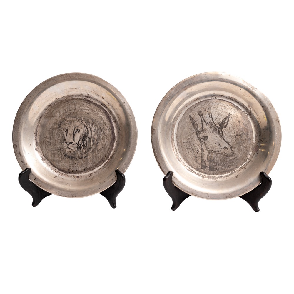Due piatti in argento Sterling, uno raffigurante 'Giraffa' - 1975, l'altro raffigurante 'Leone' - 1976