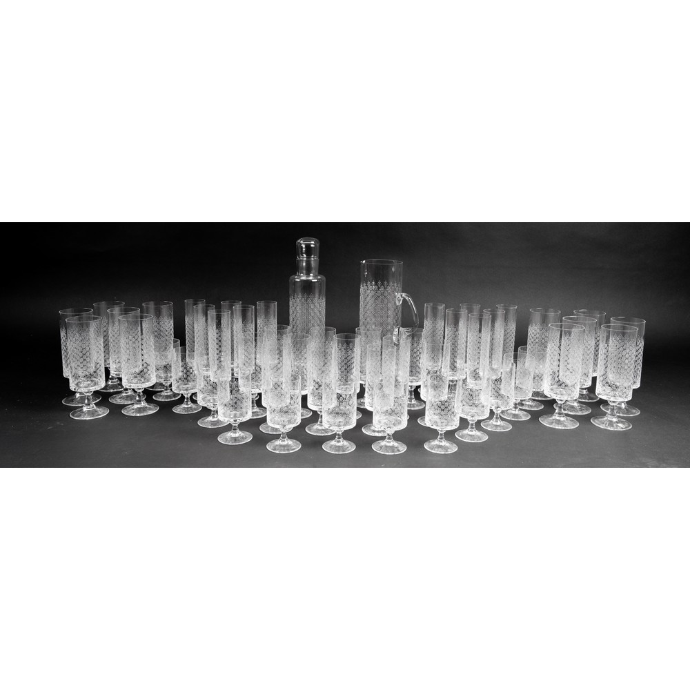 Servizio di bicchieri in cristallo composto da 12 bicchieri acqua, 12 bicchieri da vino, 12 bicchieri da liquore, 12 flutes, caraffa e bottiglia.