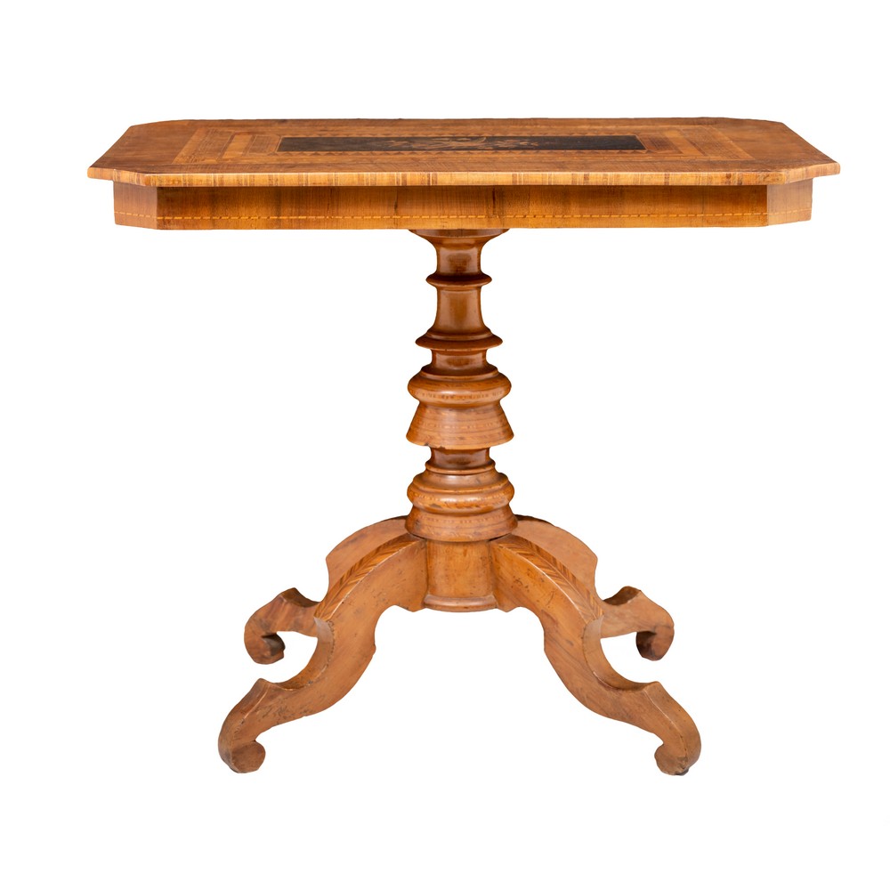 TAVOLINO SORRENTINO di forma rettangolare in legno di noce, bosso ed ebano con tarsie centrale raffiguranti 'Volatile, disegno floreale e motivi geometrici'.