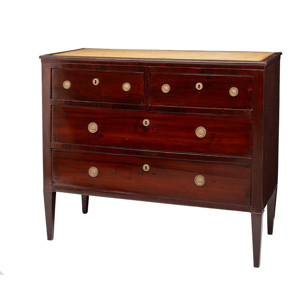 CASSETTONE Stile Luigi XVI in legno di noce a quattro cassetti e piano in marmo bianco venato incassato.