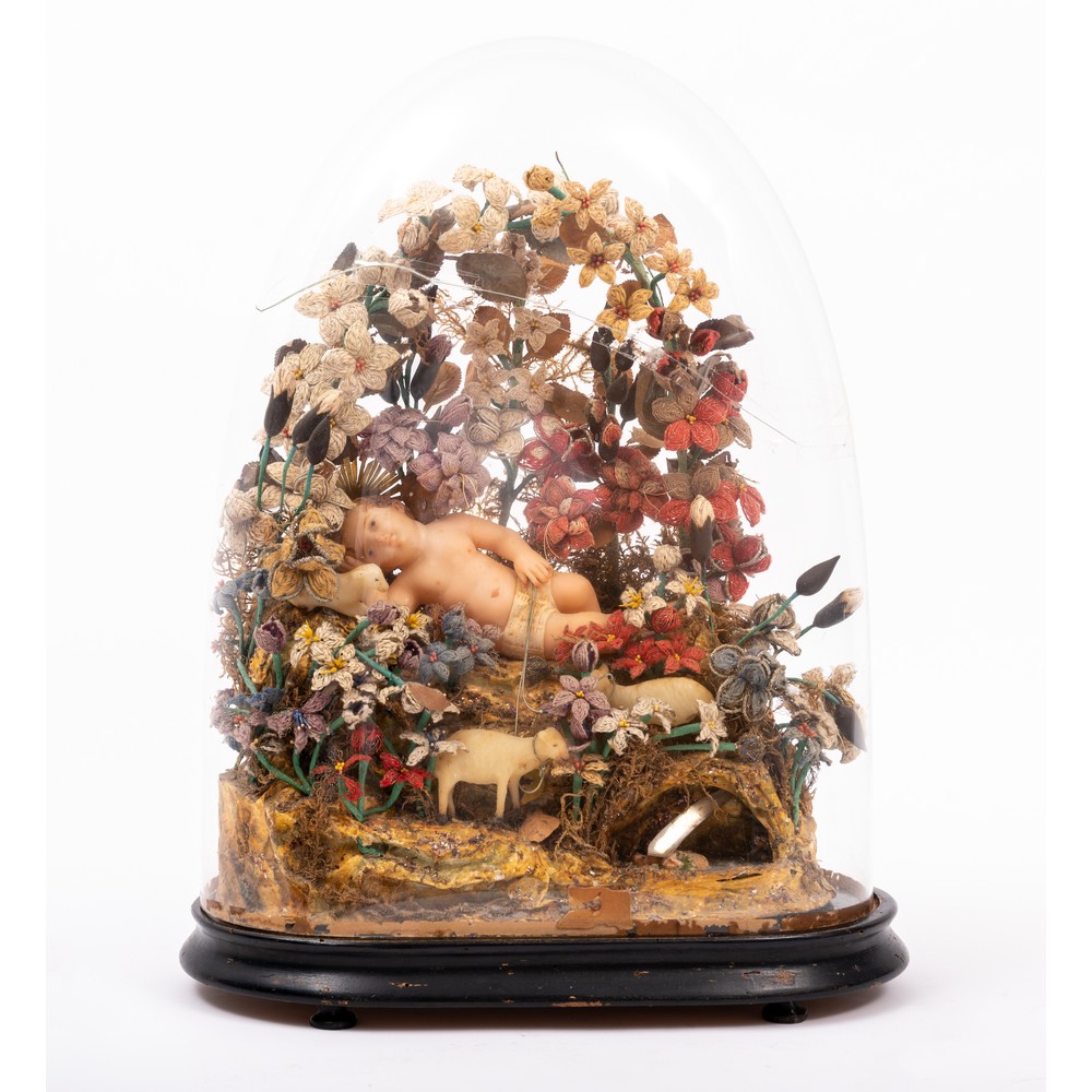 Scultura in ceroplastica entro campana in vetro, base in legno (rotture).
