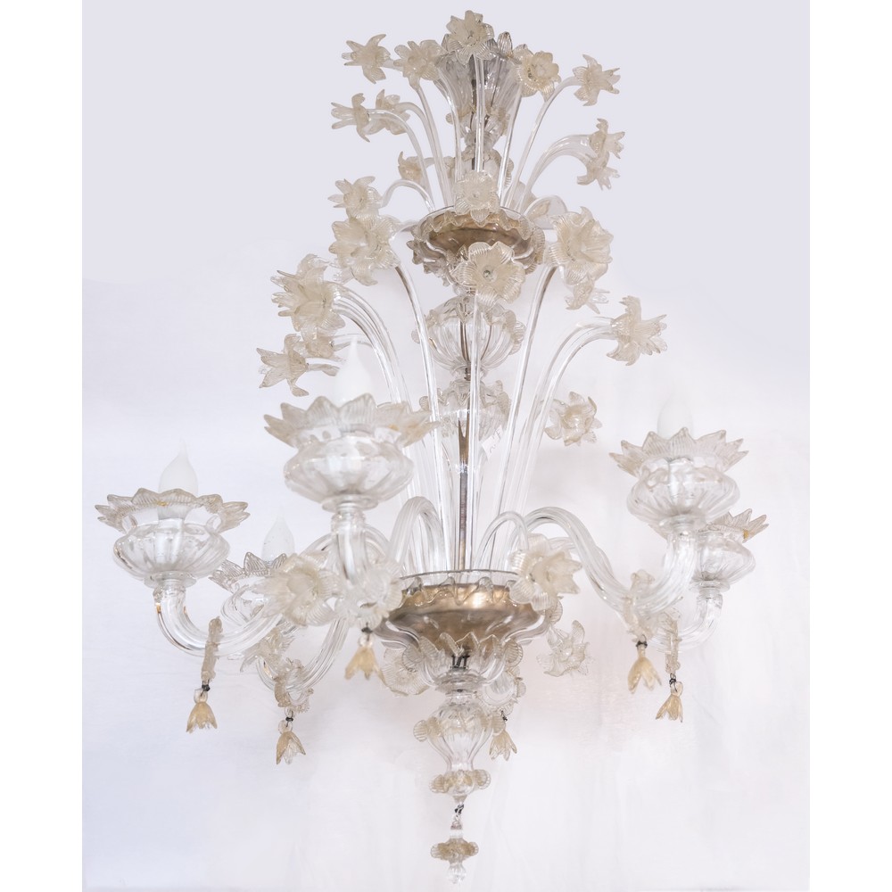 LAMPADARIO a sei luci in vetro di Murano nei toni del bianco.