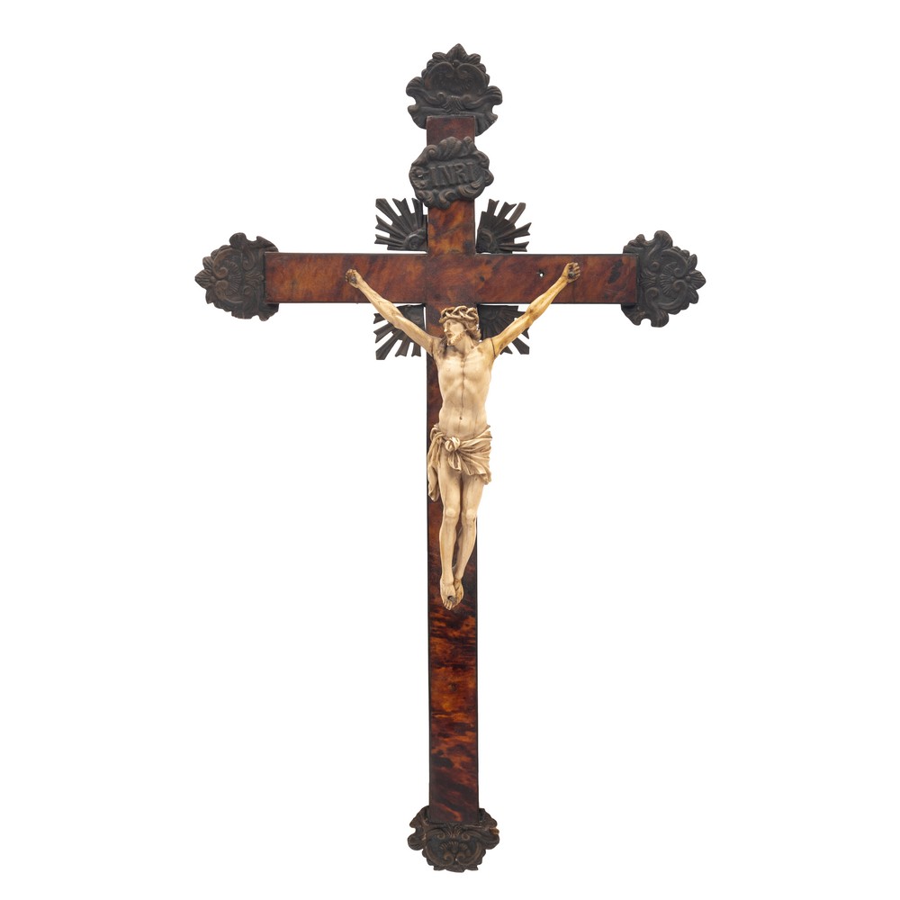 CRISTO in avorio con croce in tartaruga e puntali in argento (restauri e mancanze).
