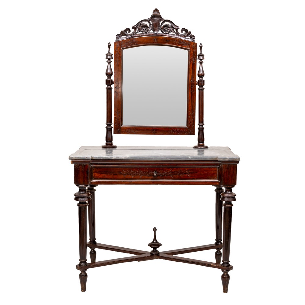 TOLETTA in legno di palissandro, piano in marmo con specchiera basculante.