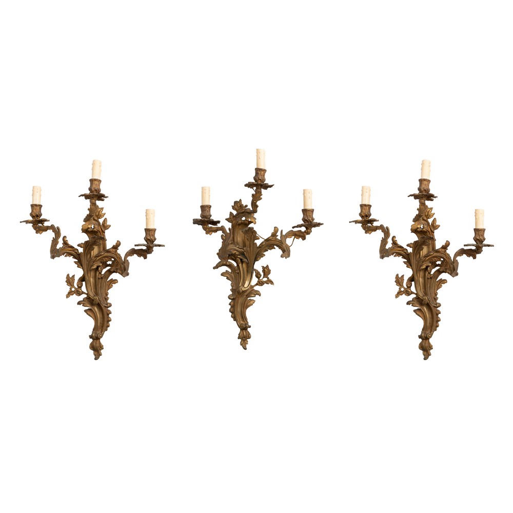 TRE APPLIQUES stile Luigi XV in bronzo a tre fiamme.