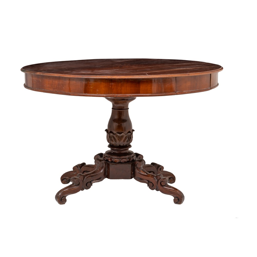 a tamburo in legno di mogano con due cassetti e fusto centrale con 4 piedi a sciabola (difetti).