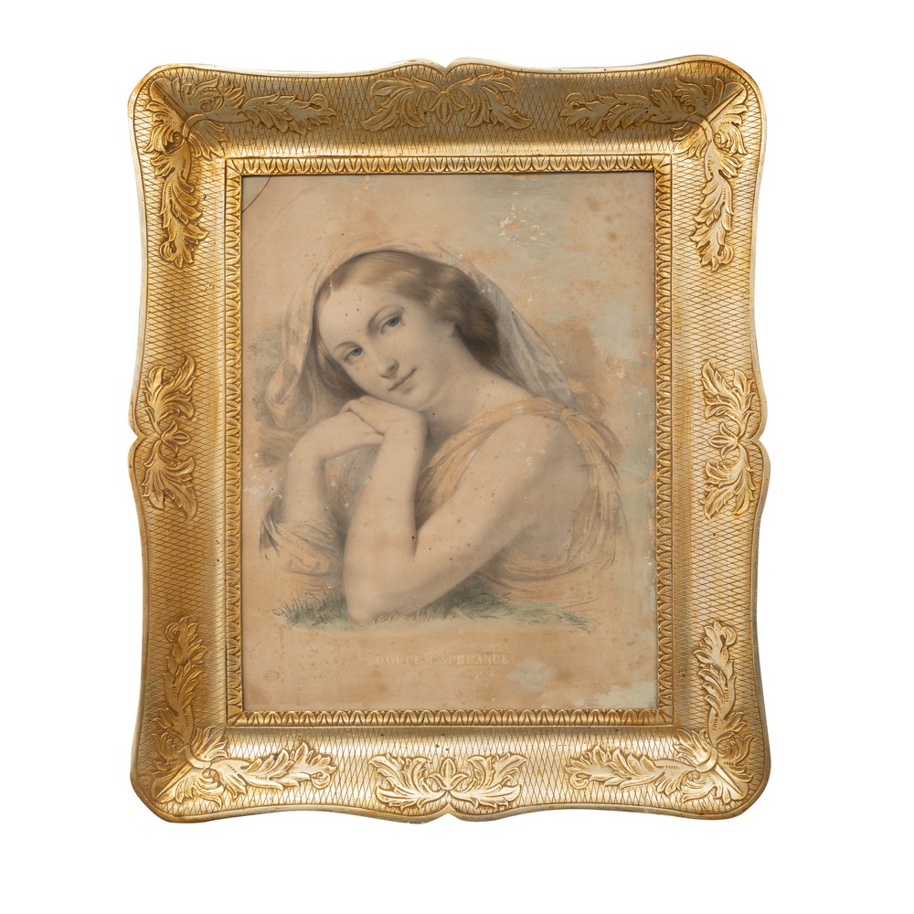 CORNICE a guantiera in legno, doratura ad argento a mecca con stampa francese " Douce esperance" (tracce di fioritura e usure nella stampa, vetro rotto).